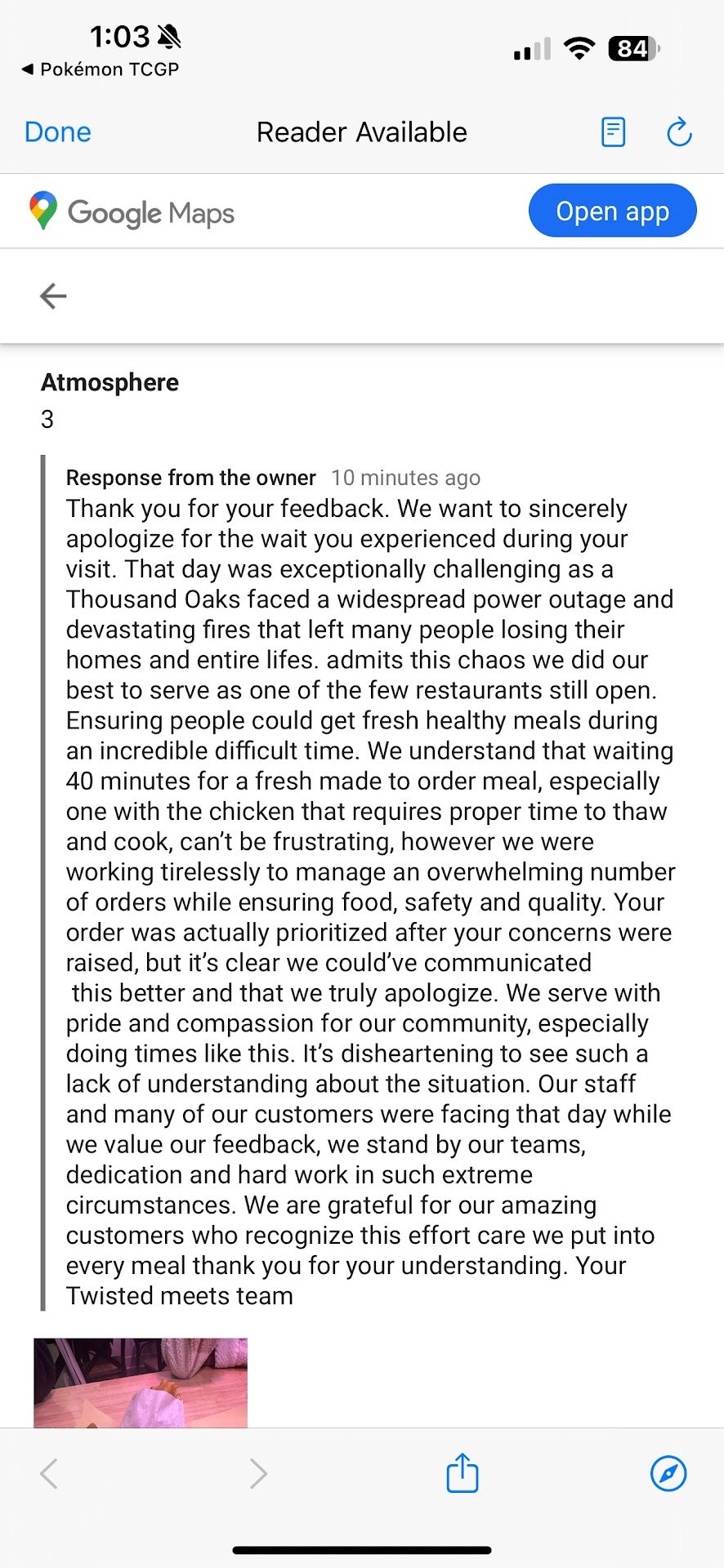 Read moreEdit 2: Never had an experience like this before. At a complete loss of words.. WHY DID THEY RANDOMLY SAY I LIKE TO EAT AT ASIAN PLACES LOL Edit: After posting this review, the owner's reply further exemplifies my negative experience. Instead of taking responsibility for the clear failure in service, they offered an abundance of excuses about the power outages and fires—neither of which were impacting the communication between service and customers, in a way to dodge criticism. They also falsely claimed my order was prioritized after I raised concerns, which is not true, as it was clear the staff had forgotten about it entirely until I asked a second time. Moreover, the tone of their reply is dismissive and accusatory, implying that I lacked "understanding" for the situation. This shows a complete disregard for customer accountability and a troubling lack of professionalism. My experience and the response from this establishment leave me even more disappointed. I would not suggest dining here.