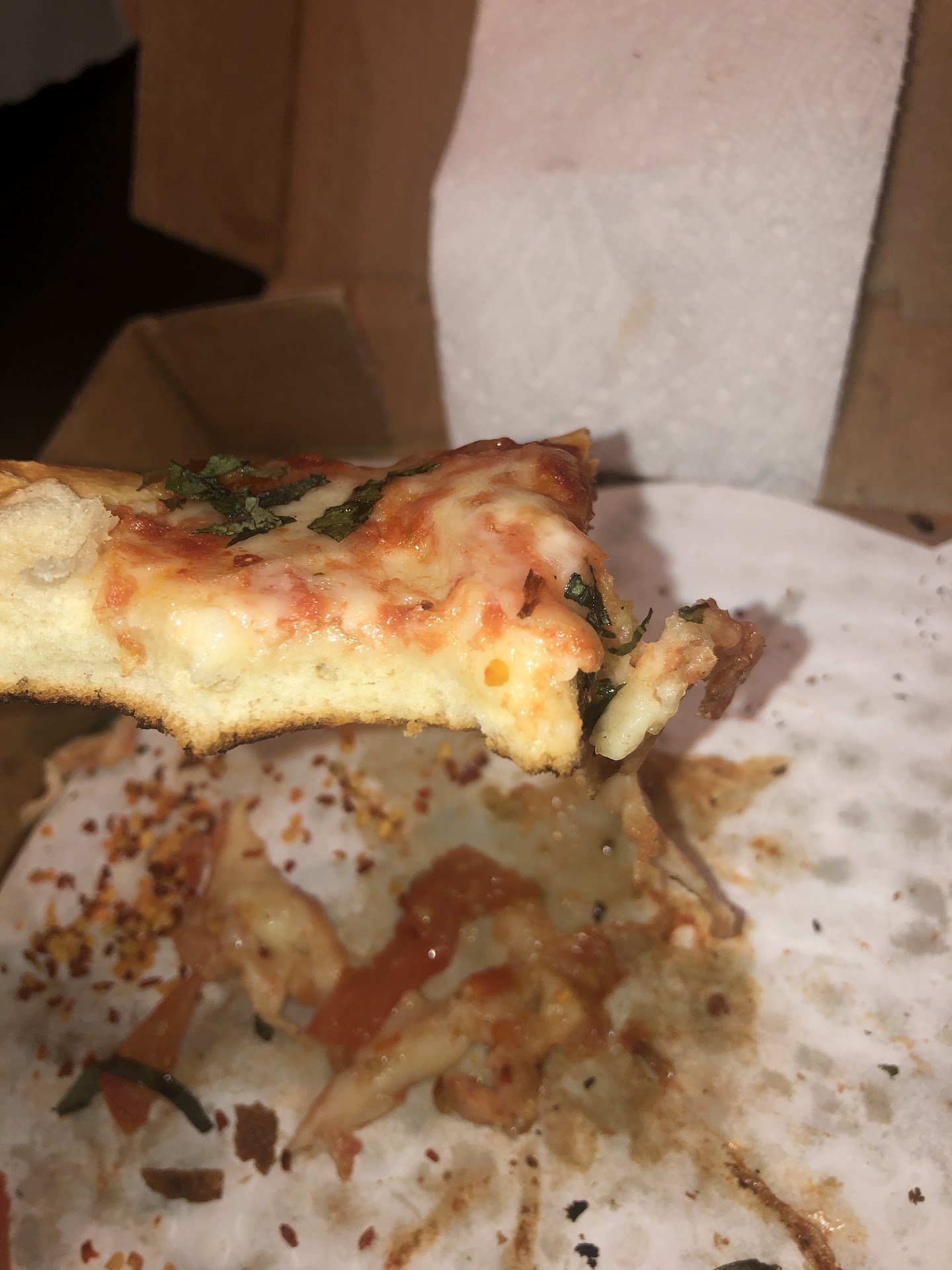Ordered a margarita pizza and itâs more depressing than a child with a severe lisp trying to say âstatisticianâ. It fails on every basic level of making a margarita pizza; it doesnât have San Marzano tomatoes, fresh mozzarella, fresh basil or even enough sauce. The cheese to sauce ratio is only rivaled by a sad, cold, and moist grilled cheese corner being used to sop up the last morsel of lukewarm tomato soup. The abhorrent volume of bread which this pizza has been built upon would have been put to better use cleaning the ever growing puddle of tears created from the chorus of crying children who have been forever burdened by the revolting existence of this pie. The basil on this sad excuse for a pizza was about as fresh my late grandmotherâs ashes. I wouldnât say this pizzaâs flavor is necessarily disgusting because it has a repulsively neutral flavor. If someone was to blend it into a fine paste I would have an extremely hard time telling it apart from the thick water old people drink when their jaw doesnât work. This is not helped in any way by the severe lack of seasoning. The only part I enjoyed about this pizza were the chili flakes which I ended up eating by themselves because they were a huge step up from this repulsive pie. Thank you for coming to my presentation. ILY. No...