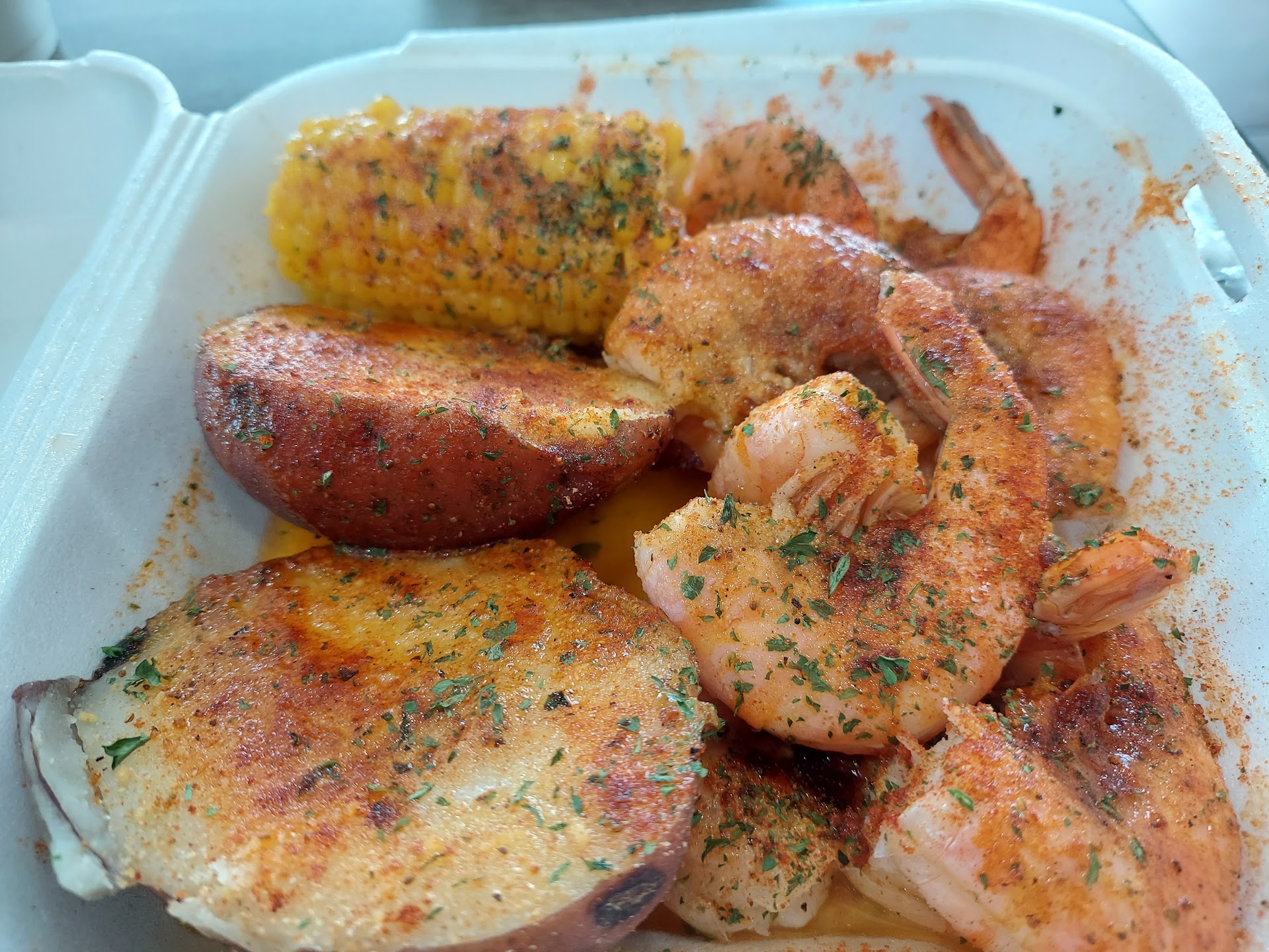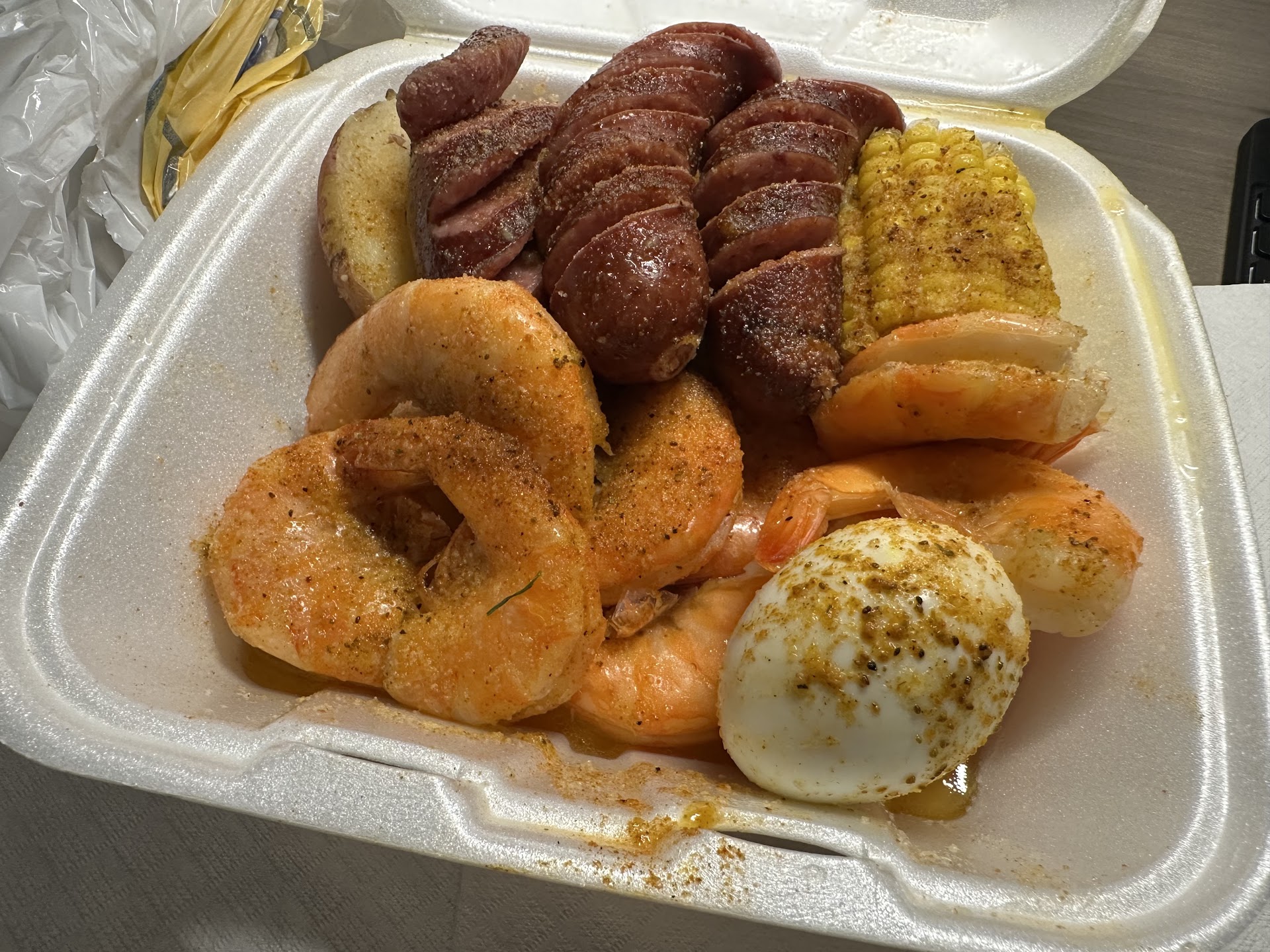 Read moreI will probably review again sometime. The staff was great! The restaurant, which was a converted old Taco Bell I think, was super clean. Now, the improvement needed... I used to be in the restaurant business many years ago and must say their sauce was very good ( I ordered the house mild) but the shellfish was soggy meaning they probably boiled it ahead of time and it sat. It was a Tuesday so it probably was a slow night but DO NOT PRE STEAM OR PRE BOIL YOUR SHELLFISH! The crab legs were over cooked because these shells were soft and rubbery and the flesh was soggy. The shrimp were mushy which meant they were over cooked and they mixed old shrimp with newer, yes I can tell the difference. The corn was full of sauce flavor but were soggy, again boiled or steamed too long. The eggs were overly soft and the yokes had grey around them, again over cooked. The sausage were fine but I suggest that they slice them into bite size pieces. The potatoes were overall good but again old mixed with new. Bottom line, Shellfish usually doesn't take long to cook and if they made fresh to order on the shellfish and didn't over cook the sides I could see myself giving them 4-5 ⭐️s. I will definitely try them...