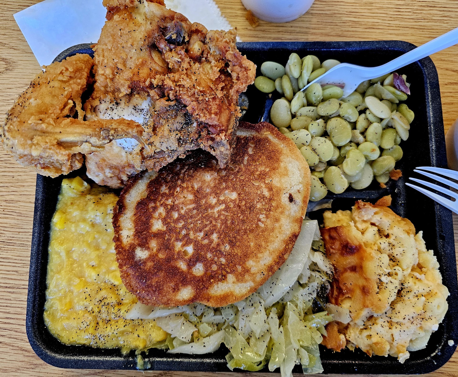 Read moreEasy to find, large parking area, no menu prices listed, but great value for the price (1 meat, 3 sides, hot water cornbread, dessert and a house made beverage - iced tea, lemonade, arnold palmer or water for less than $16 excluding tip). I chose fried chicken (golden fried and nicely seasoned), macaroni and cheese (no seasoning at all), candied yams (perfect sweetness but no flavor) and cabbage (steamed with a tiny pinch of salt, but still no real flavor).