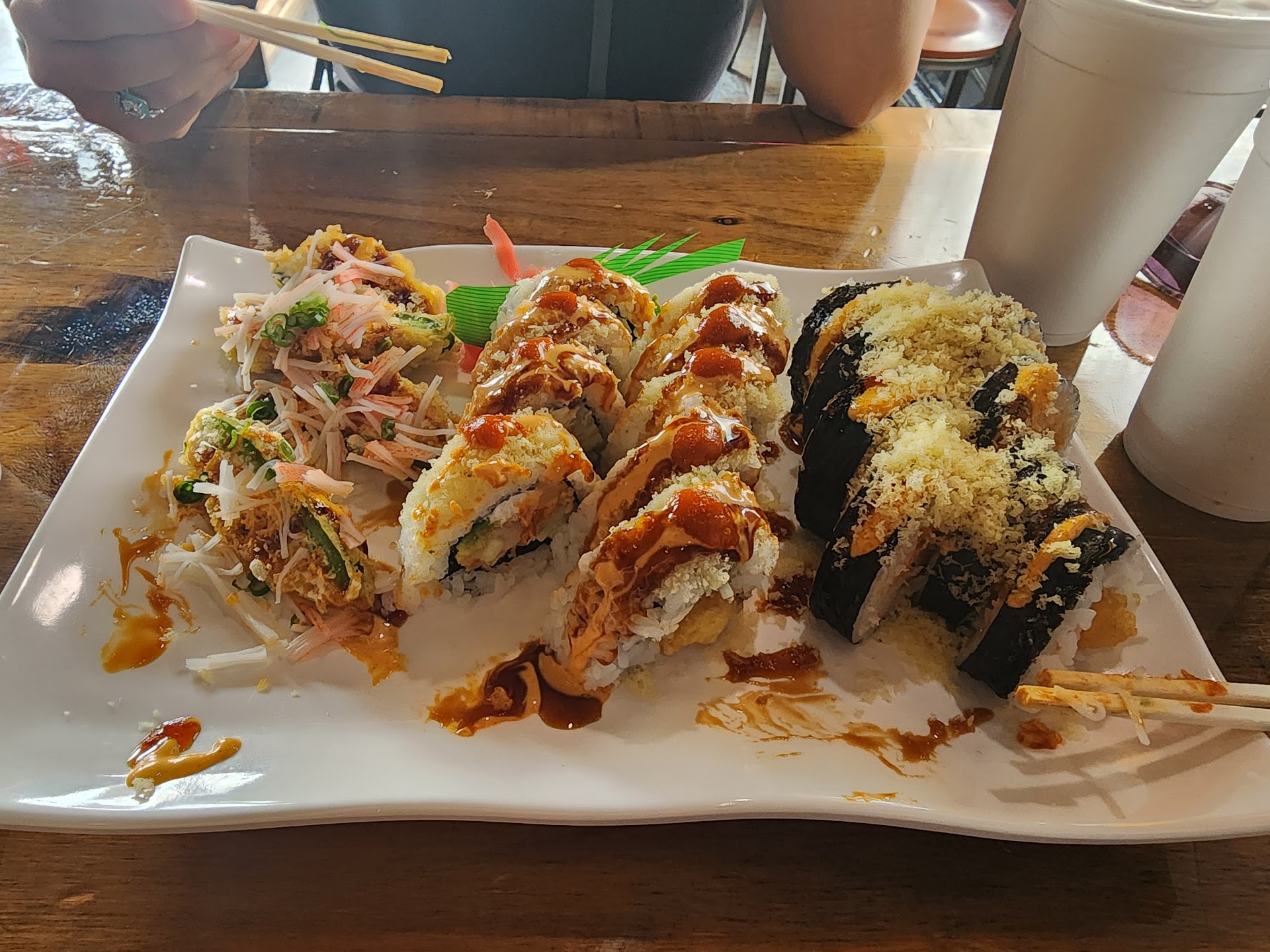 The fish on the sushi left a horrid after taste that left me wanting some alcoholic drink to wash it down. It also caused my wife to vomit a few minutes after leaving.