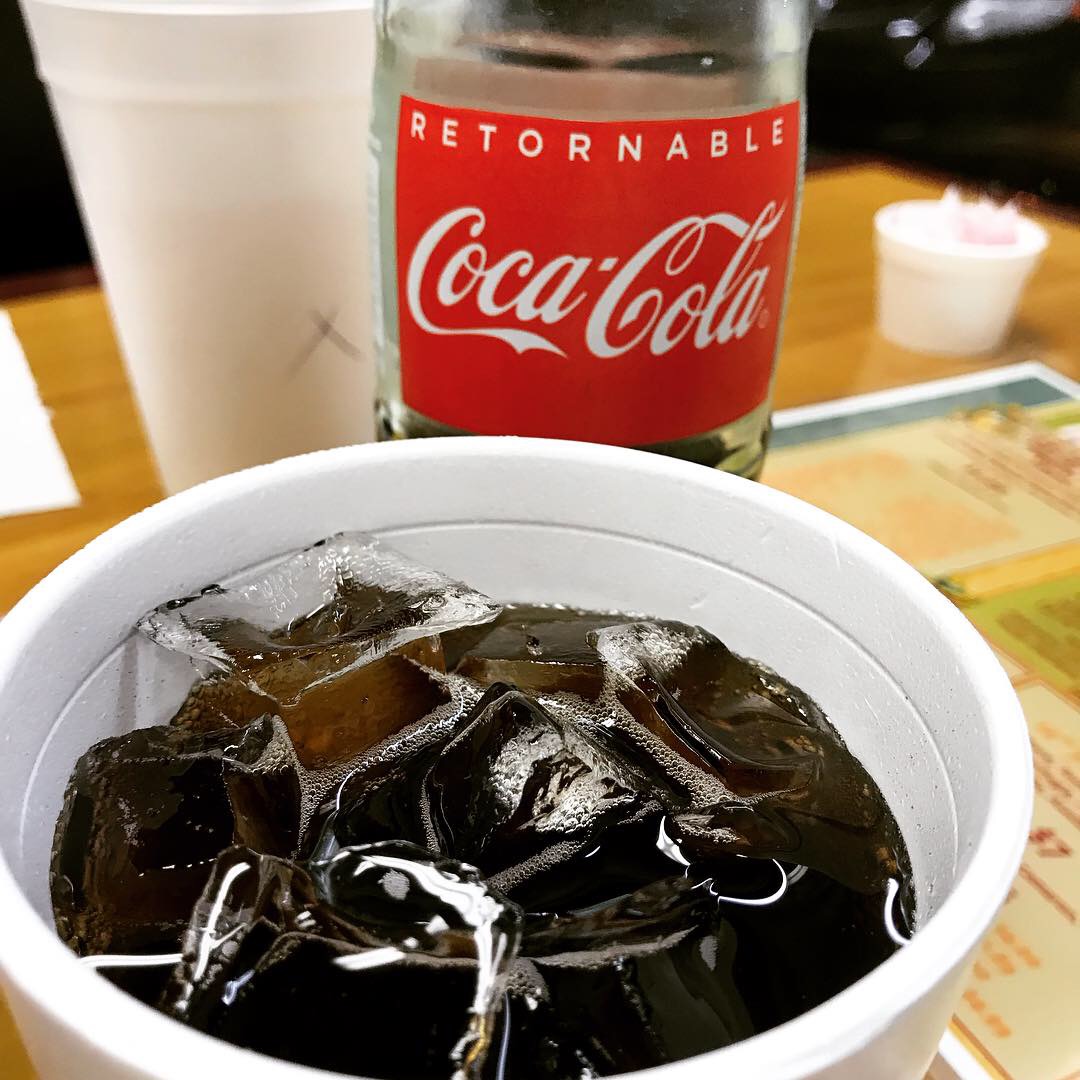 After looking over previous Yelp reviews, I had the chicken taco & the lime beef taco, and both were wonderful but I can say with 100% conviction that the chicken was the best taco I've ever had. Flour tortilla with onion, lettuce, cheese, sour cream & cilantro, sounds pedestrian, but don't be fooled - it was other-worldly. They also have tongue, tripe & pork options I didn't try on this go-around. Hub had the burrito bowl, which was a menagerie of the lime steak, poblano peppers, rice, sour cream, chipotle ranch sauce, roasted corn, cheese, zucchini, & tomatoes. At $8, he didn't find he preferred it over the ridiculously good $2.50 tacos I had, but he still thought it was super good. They sometimes have fruit waters on the menu but not tonight - he had tea and I splurged and drank a Coke served in a tall glass bottle just like when I was a kid (only bigger!).