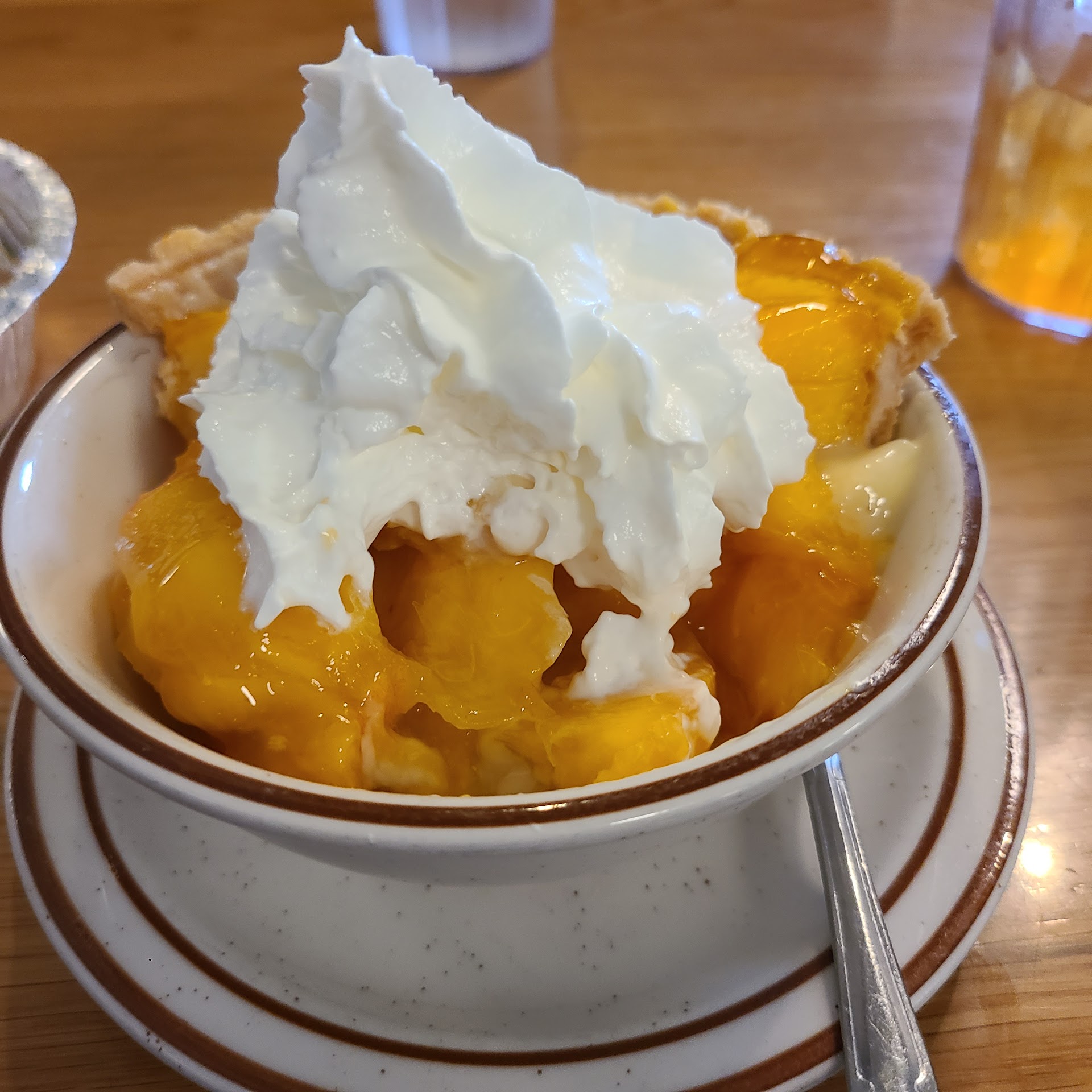 I asked about the "seasonal pie" and when my sweet server said Peach, I had to order it. This is what made me have to write this review: I was shocked to see that another reviewer didn't like it! Ha! Of course we all have different tastes, but here's another POV from a long time peach pie lover. She mentioned the vanilla cream layer, but it was a small part of this pie (see that you can’t even see it in my photo, taken after one big bite. Yes, it was a surprise but IMHO it was creamy, not too sweet and it worked, by just adding a little something to the flavor profile of the peaches. I agree that the crust was perfect, but for me that means not only light and flaky, but also restrained, as in thin, and not at all tough. The juicy peaches were perfectly ripe, and baked lightly with only enough sugar to bring out their fresh goodness. As you can see, the pie portion size was generous as was the real whipped cream topping. I just can't find anything to improve upon... OK, maybe that my table service didn't include a knife. I love clean, fresh, local ingredients and a light hand with seasonings, fats and sugars, and Bannings was a...