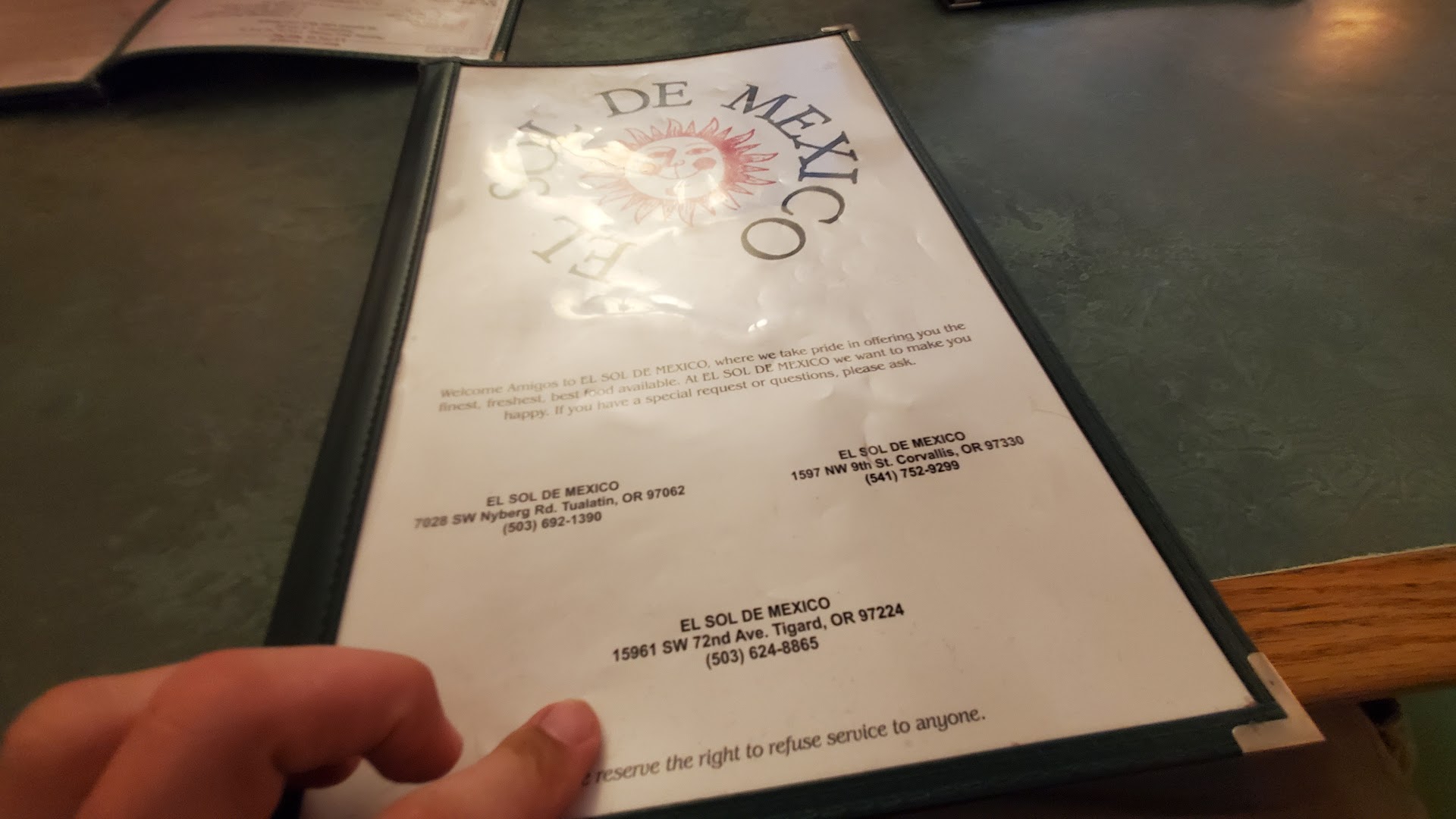 Read moreMonday night at around 7:00 PM. The restaurant closes at 9:30. We were the only customers in the restaurant and one of the staff started to mop the floor with a heavy concentration of pine-sol. The smell was overpowering so we asked to move up front away from the smell....no problem. However the staff person who was mopping came and told us we would have to move to another area because he needed to mop the floor. We told him that was why we moved earlier. He did not care. I told him we could not eat with the heavy pine sol smell and if he insisted we would have to leave. He said he needed to mop the floor and we could leave. I reiterated again that if he had to mop the floor we would leave, and he said fine, leave. Hard to believe that they would kick out their only customers so they could mop the floor two hours before closing....with literally no apology. So we left and went to Choza in Bridgeport Village and had a great meal, where everyone was smiling and very helpful and the food was awesome. I will never give El Sol de Mexico my business and I will make a point to tell friends and family about my experience. I hope the owners realize they have staff turning customers away, creating bad publicity and losing business all so they can.....what, leave early on an Monday. Very bad form El...
