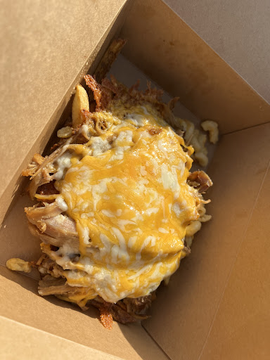 Crispy Fries topped with gooey Macaroni and Cheese, the most DELECTABLE smoked Pulled Pork, shredded cheese, and a BBQ sauce to condemn your filthy soul. Jalapeños if you want to add a kick to an already divine mound of pure and unadulterated happiness.