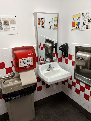 Read moreI love this chain. The food selection is purposefully small. Burgers, fries, milkshakes. There are always 5 employees who are always visible from the rest of the restaurant. The burgers are very juicy and the fries have skins on them which I love. The volume of fries you get for a single order is often enough for you and a friend to share. There are fountain sodas and water. The milk shakes are the newest addition to the menu and I have yet to try one. Others have said they are good. It's sit in or take out but no staff to come to the table. (There are 5 people total) The seating is not the most comfortable. Small tables with metal chairs but we often get it to go. There are boxes upon boxes of free peanuts and they are open. There is lots of peanut dust in the air. There is a warning sign on the door stating this fact. I've been to 3 different Five Guys and none of them offered Salads, sandwiches or anything other than the items listed above. The prices are steep for burgers to go so we don't frequent them. They're very often located near strip malls so there's a good amount of parking on flat lots and generally visible from the road. If you're passing through and need a quick bite, I...