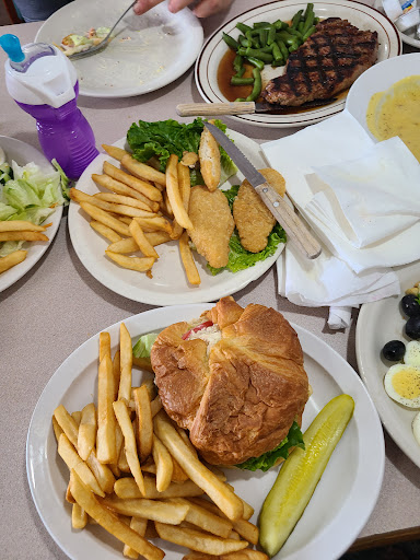 This is a quaint little restaurant, that serves breakfast and dinner open to close. It had a cozy white & black theme inside, with old black & white pictures on the walls that look like they could have been from a museum. There's a decent amount of parking spaces. The bathroom looks like it's slowly being updated: the stall I went into has a broken lock, there's an air drier, paper towels, push soap & a non-touch door handle. They're getting there 😅 Service was great. Restaurant seemed a little busy, but there was no wait. When we were seated, the waitress was at our table within a minute or so, then a busboy dropped off silverware. The waitress was very attentive and answered our questions with honesty, she was not just trying to make an extra dollar because she wanted to sell a more expensive plate. I'm thoroughly impressed with that. She was very friendly and prompt. I was patiently waiting for her to walk passed again to ask a question about payment, because she didn't take the card off the table when she was talking to us. Another server noticed me and asked if I needed something! That's great teamwork 🥲 (you pay out the front desk counter not at the table) The food was average. We got a mushroom burger. The mushrooms taste like they were canned, not sauteed, just placed in the burger. The rest of it was pretty good. The lemonade is pink lemonade, doesn't explain that on the menu. Our son had the silver dollar pancakes, which were pretty good. There were 6 on the plate.