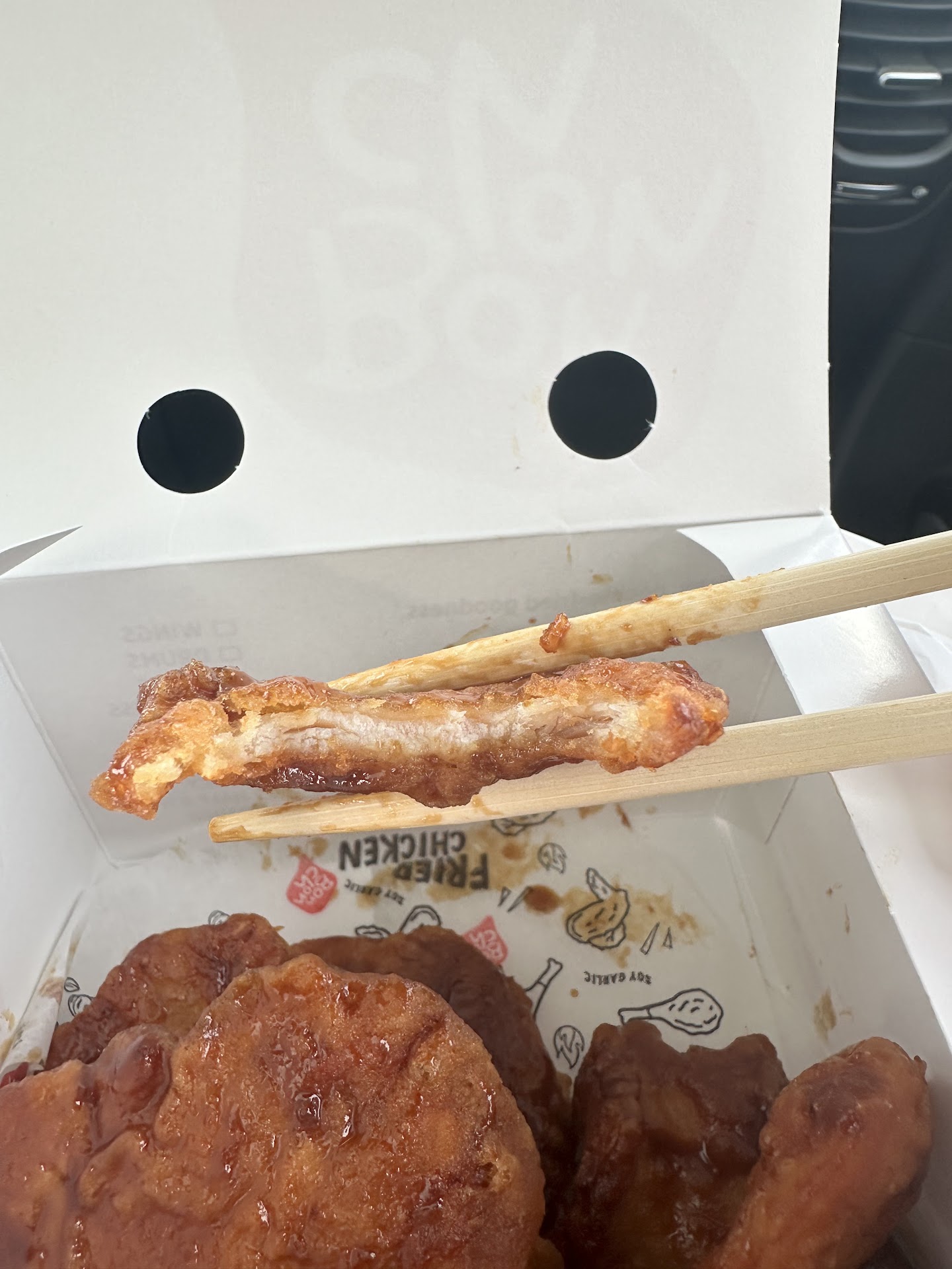 The flavor was definitely there and had that "Bonchon" taste as one could call it, but the size of the wings were abysmal. Normally the wings would be pretty large for what you pay for, but they were so tiny that they couldn't fill up half the box, and I got a 20 count. The breading weren't as crispy as they usually are; the best way to describe it is it would crumble as you take a bite. In this case, the breading stayed fully intact. For $30 I would call that unacceptable.