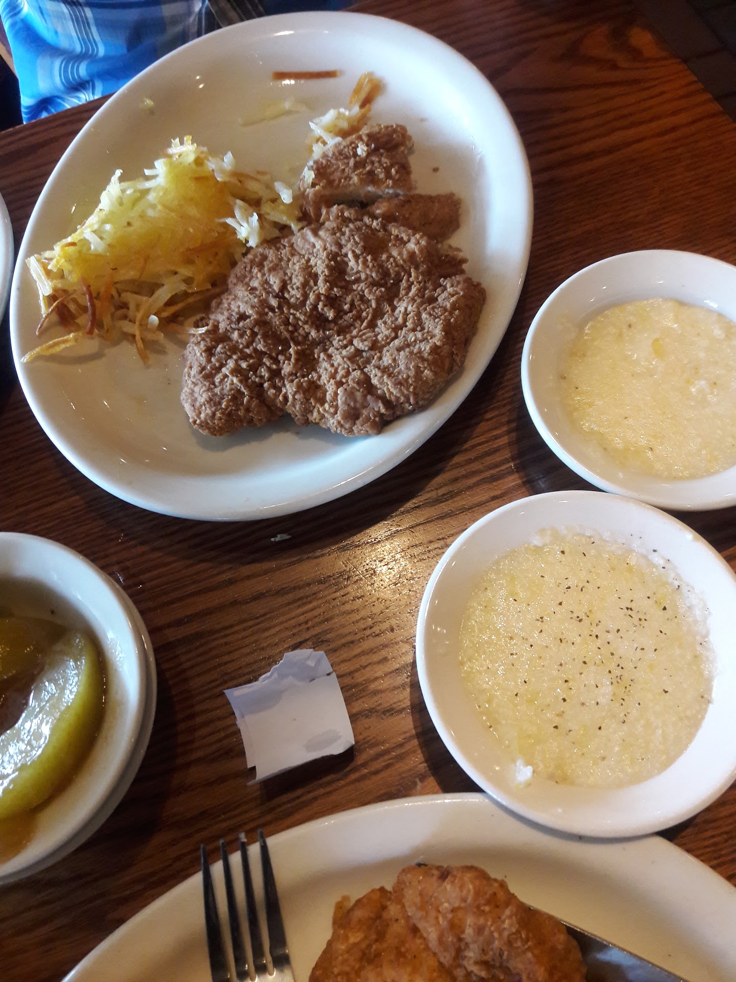 Read moreFirst time back at Cracker Barrel in over 20 years, and this visit on 4/12/25 may be my last. What a weird and terrible experience. The good: I liked the meatloaf, the Mac and cheese by all means tasty, chicken was also good. The bad: fries underdone and raw like in the middle, cornbread burnt and dry, no biscuits were available for my fiancée’s order when food came but were promised to come out soon but never came out; my fiancées breakfast for dinner order must’ve been finished 20 min before my meal was done cooking and most likely sat under a food lamp that whole time since her scrambled eggs had the consistency of a hard boiled egg and the bacon was like leather, tea was supposed to be unsweetened yet a peach tea came out. The ugly: walked through the knick knack shop at first and started getting some nostalgia back and excitement, then we go to be seated, and must have stood there for 7-8 minutes with no worker at the podium, then a shop worker called for a hostess over their radio, and another 4-5 minutes before someone came. We’re seated, and order appetizer, takes at least 15 min. We order our meals, and it must have taken 40 min for them to come out(again, her meal must have been sitting under a heat lamp for 30min). While we are waiting, couple next to us is seated and orders. Another table of mom and 5 kids come. The server yelled at the family of kids for asking for plates. Manager is called, things are weird. I look around and see left over plates and mess from tables left long ago. I see people sitting around and waiting with only drinks on the table looking around and wondering where their food is. The couple next to us wave the manger down asking about how long their meal will take. She comes and brings out the lady’s breakfast meal, guy’s meal is not ready yet, but first thing I see is her touch her pancakes and say they’re cold, the ball of butter on top never even slid or left any streak of melted butter from my vantage point. They bring out his ribs and take her pancakes back to the kitchen. Another couple behind us also waiting for food, and the food comes out, but I hear the server say “so sorry we’re out of tartar sauce, probably should have told you before”.