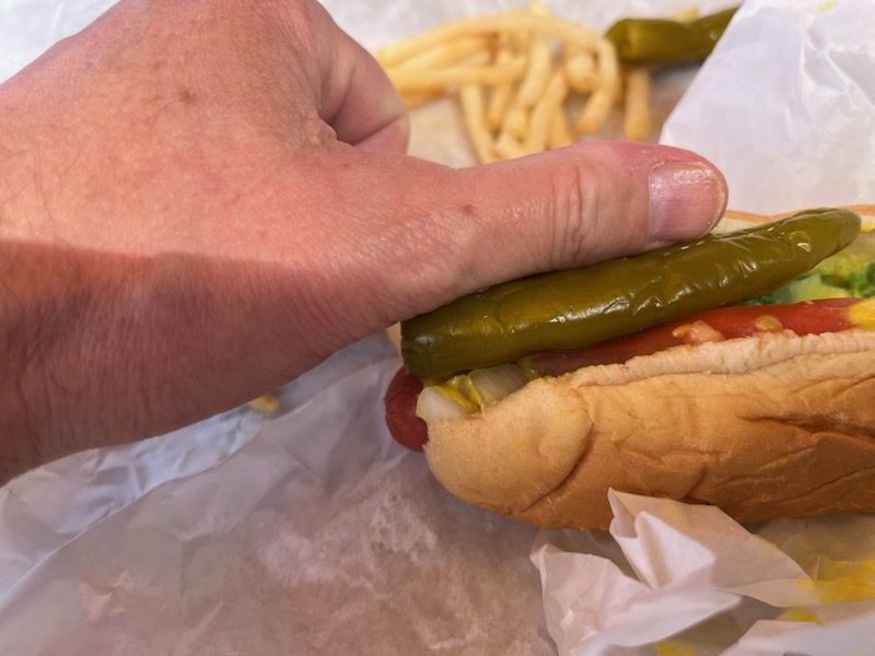 First, the hot dog. ordered with everything and sports peppers. The pics show these were not sports peppers. I think they were pickled Serrano that tasted nasty like the tin can they came in. The bun has no poppy seeds and was hard as a rock. The dog itself was a skinless, limp, luke warm, and tasteless dog. The dog had too much mustard, a small blob of relish, hardly any onions, no celery salt and no sports peppers. All in all this was an awful Chicago dog