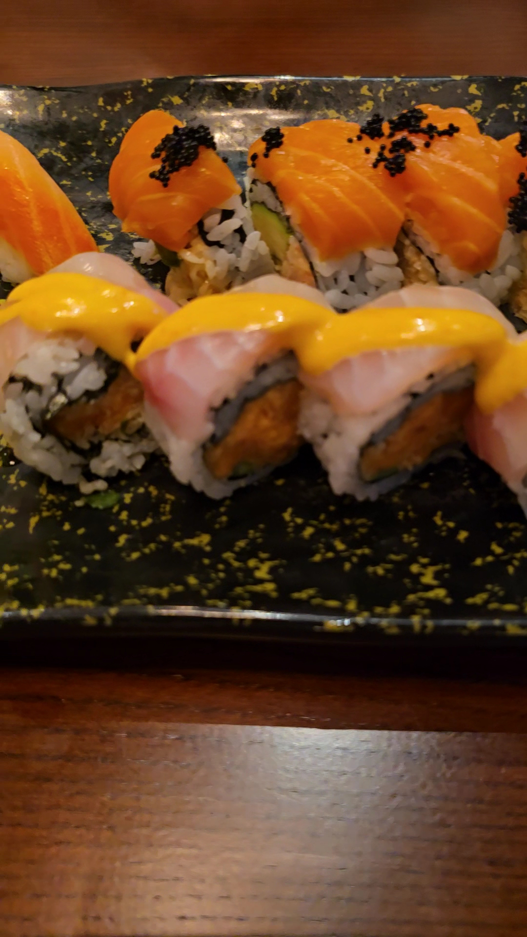 Came here on new years eve, place wasn't busy at all which was a surprise around 7pm. We were seated immediately which is a plus, they have two menus, one for all u can eat and the regular dining, we took both just to compare and see what was most suitable for us. We ended up getting the regular dinner menu. Ordered two steak teriyaki bento boxes, a flaming dragon sushi roll, and the i80 roll. Now here's where things go down hill, when u get the bento box, it comes with soup and salad. We received our sushi about 15-20 min after ordering and I'm sitting down wondering why do we have this before our soup/ salad, we ate our sushi rolls and waited another 5-10 minutes before we received our bento boxes. We had to ask the server ( who we failed to remember the name of even if he gave it) , doesn't this meal come with soup and salad đ. He goes oooooh yeah your right, with all due respect, why would u go back and give us our soup and salad when our boxes are in front of us? But back to the food, our gyoza we received was cold to touch and taste, our rice was cold as well so we had them take it back and bring out some hot food. During that time we tried the salad and soup, me personally I don't do dressings on my salad so I let that go to the side because it came with it on it. But the soup......... We had the same soup so why did one look pale and watery in comparison to the other bowl??? No flavor at all, the miso soup wasn't it at all. So after pushing the soup and salad to the side, our new boxes came out, the things that weren't hot the first time definitely were this time, but after all that, food was very mid. Steak was okay, fried rice was very heavy and lacked alot of flavor, no veggies, just egg and rice. Maybe that's how their fried rice is but the fried rice I'm used to has vegetables and the protein it says it has in it but anyway, now on to the ending service. Our server seemed as if he was high. Talked in a low tone, didn't know what went with our meal ( no knowledge of the menu), on a slow night u are standing around while we didn't receive bout items that were ready as we watched them on the sushi counter. There wasn't any communication between us which is kind of a big deal if your the one giving us our meals and drinks. If I were to go back, it would have to be for the sushi and at the bar so I don't have to worry about a slow service on a slow night. I hope the place gets...