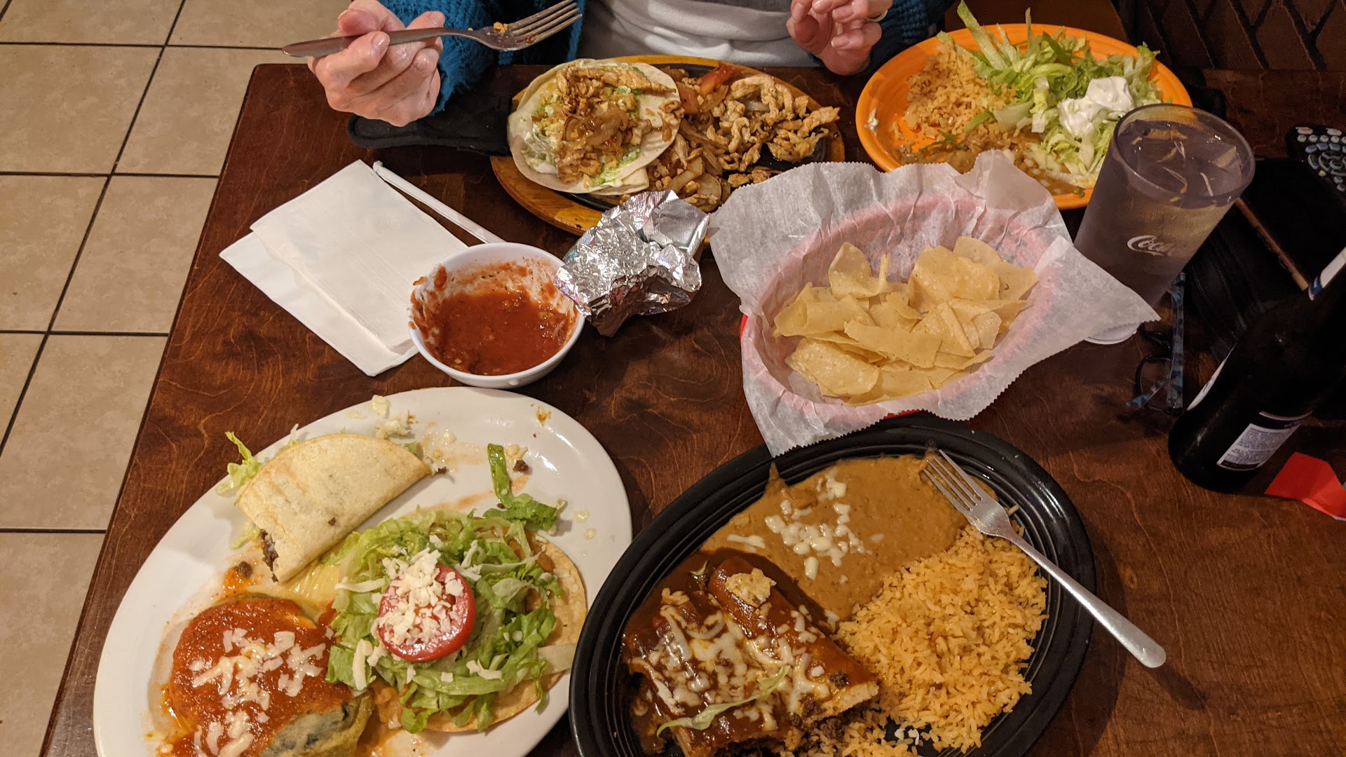 Before we could say “tamale” a big basket of fresh chips and salsa were put on the table in front of us, a nice surprise considering we were starving. Drinks were served immediately and the order only took less than 10 minutes.