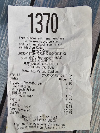 Read moreEvery time I go here I get a large fry for the pets . The fry isn't full to the top let alone should be bringing over. Once at the 5th time this happens I drive back around & complained. The person at the window said.... their probably in the bottom of the back did you ck? I said those many, why would you dump fries in the bag? I showed her the bag. Oh... so a month later I go back same freaking thing w large fry & the sm fry, are not full. DON'T GO THERE!!! I feel the owner has conveyed to the mngr.... to save some $$ so shorting fries is it. To much of a coincidence for it to be happening on a regular basis. I also stopped for coffee on February 9 at 530a for coffee n sausage sandwich w extra cheese....they where made Ahead of time! The extra cheese wasn't melted. Yuk!! And atmosphere you don't get spoken to, you don't get greeted, you enter push buttons on a screen wait for your number to be called!!!! WHAT ATMOSPHERE! Midland is a nice town we don't need a business like that here. This is the location on the corner of saginaw rd near the hospital. Go to the location further down saginaw. As a community, if we put a hurt on their business maybe they will realize people in Midland won't tolerate that & pull it together! I know fries, Really lady? No it's Not about the French Fries! Its how much $$$$$ are they stealing from the people of Midland who support their...