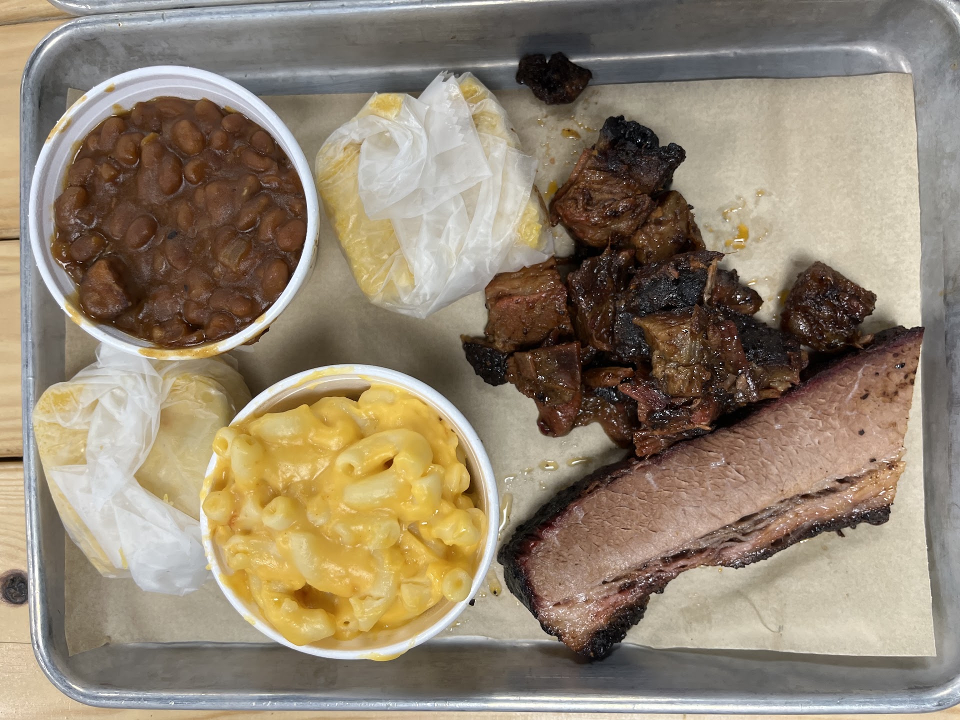 My wife and I visited for the first time after rave reviews from a friend and seeing great google reviews. Parking was nice and easy, building looks very nice, both inside and out. I ordered the twin fins which gives you the choice of two meats, two sides and two pieces of corn bread. I chose brisket and burnt ends with bbq beans, mac & cheese and the two pieces of cornbread for $23.99. My wife got the brisket platter with a side salad and bbq beans with corn bread for $19. Our total after taxes was $46 with no drink, which was expensive, but if the food was great, I wouldn’t mind it so much. Sadly, we didn’t really like anything. The brisket was tough and it had a lot of fat on it, even though I ordered lean. The burnt ends were mostly fat as well. The beans were very thick and pasty and the mac & cheese tasted like it was from a can. The cornbread was too much like a piece of cake. It was extremely sweet, soft and sticky, almost gummy. Not at all like southern cornbread. I watched the video on their website and realize that they want to create their own “genre” of bbq called “coastal bbq” but what does that really mean? Good bbq has already been created, if done right, it is good already. This new “genre” is not good, not at all.
