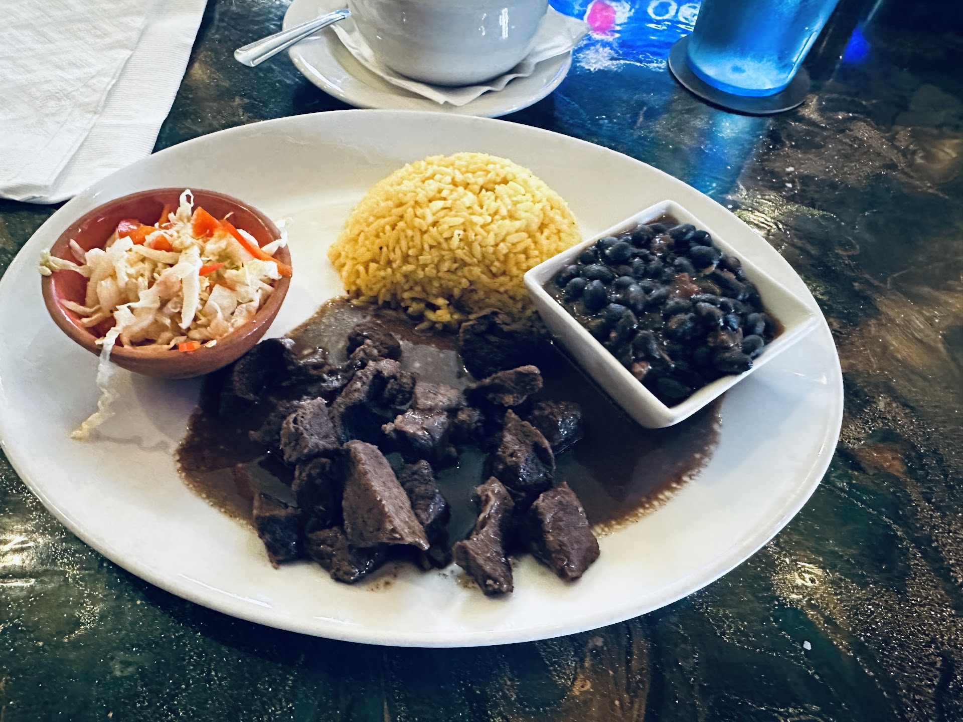 Moving on, I found the Haitian Beef Griot to be the opposite. In this case, the rice was slightly undercooked. This makes one ask, was the rice cooker on the fritz, or did someone become distracted for a minute in the kitchen? The chunks of sirloin were tender and perfectly seasoned and the accompanying Haitian Pikliz (slaw) and Caribbean black beans were outstanding and had my taste-buds breaking into an Affranchi. I would be remiss if I failed to mention the incredible flavor of the Hibiscus tea. This was a true delight on the palate and perfect for washing down a few forkfuls of the slaw. I have to say, if the rice in each dish had been prepared and served to the standard of the Pikliz, this would have been a solid 4.5 stars. However, as it is,