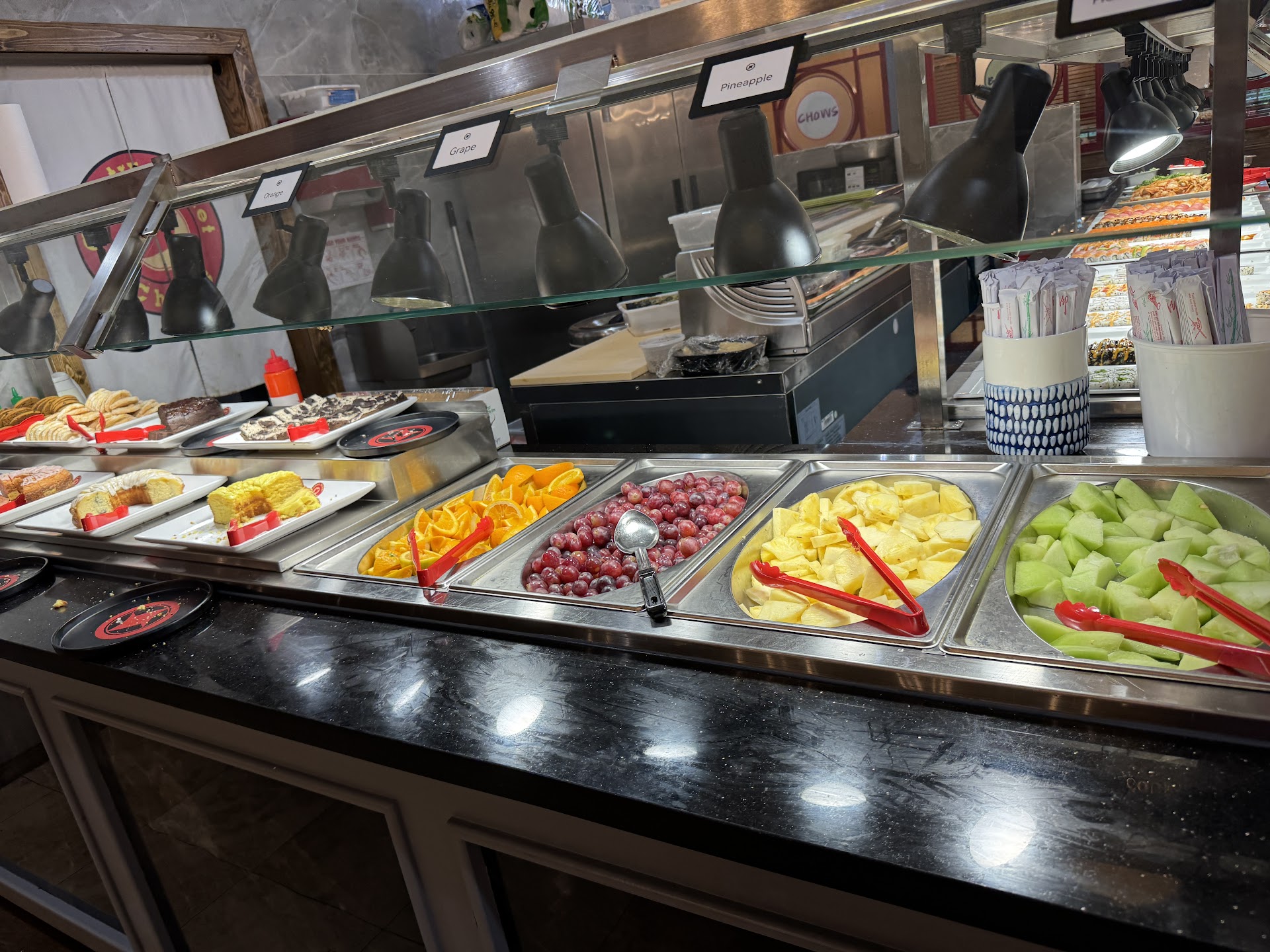 We waited a bit after this restaurant opened to let them work the kinks out before trying it. People that go right away and expect everything to be perfect are ridiculous. We came in for dinner on a Wednesday about 6:00. The parking lot looked pretty full so we expected a bit of a wait. NOPE! Walked in to an empty waiting area, greeted quickly, asked about our drink choice, and seated within 2 minutes. The layout of the hot and cold food bar was pretty large and conveniently located in the center of all of the seating areas. The full parking lot was not apparent inside, there is a lot of well organized seating, with several little room areas dividing up the overall restaurant. I decided to start with the sushi bar. I am not a huge fan of premade sushi and have high expectations of fresh, non fishy smelling or tasting fish, especially when consuming it raw. I took one of each piece of sushi,(not the vegetable roll or cream cheese roll, pretty hard to mess those up and not may fav). All were good and I really enjoyed getting to try the eel roll without having to commit to an entire roll by myself (hubs won't go near those). The volcano roll was really good considering it was chilled and it is typically served hot. I had barely finished with the last piece and a server came by to whisk my dirty plate off the table. The servers all appeared to be very quick on cleaning up the used plates. I then decided to check out the rest of the bar scene. Salad bar with the usual options, all appearing very fresh and well presented. The bar contained some standard hot bar fare, pizza, soups, and a good number of Asian options. The pork pot stickers were exceptionally good, be sure to get some of the chili sauce. We finished up our meal with desert which hubs made a sampler type of plate for the two of us. The desert options were different types of cake, fruit, ice cream cups, and pudding. A nice finish to a pretty decent meal. For a buffet restaurant, the staff appeared to be constantly cleaning and restocking the food, which was nice to see. This is one that we will return to...