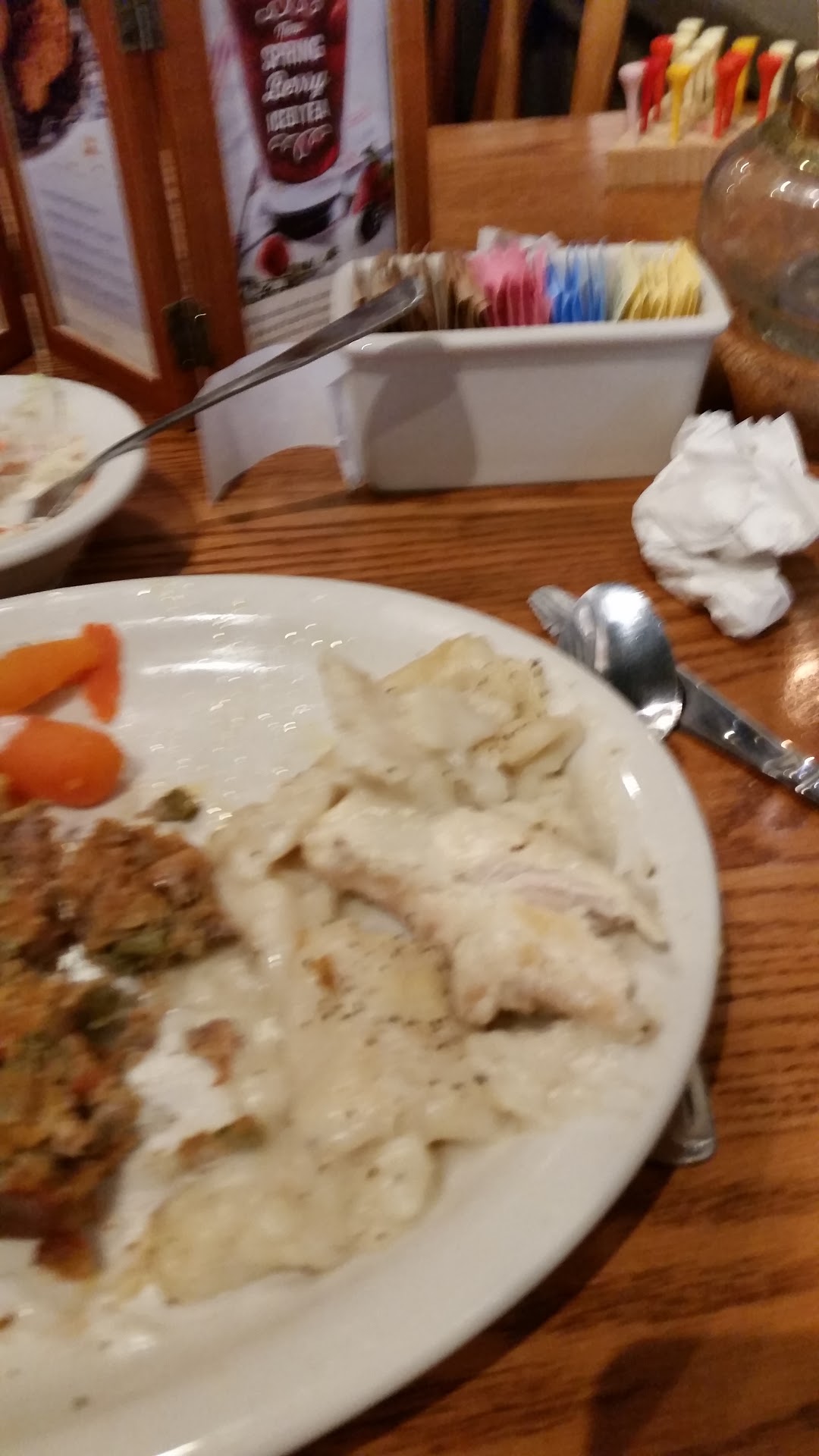 Ā Ā Ā Read moreI love eating at Cracker Barrel because of the variety and quality of food, even though it is usually pretty noisy...which sound barriers would help resolve that issue. I rarely have any issues eating at Cracker Barrel, and I have made many positives comments in the past. However, when I last ate at the Titusville, FL location, I ordered the vegetable plate, as I have done so many times, but ALL my food was cold...green beans, mac and cheese, and okra...and any time okra gets cold, the coating and "skin" gets really tough. Mine was unedible...so I didn't eat it. When ordering it, I had asked the waitress for Ranch dressing to dip my okra into, however, none came when my meal was delivered. So I asked her for the Ranch dressing at that time...my waitress was the one who delivered my food. She never brought me any. I went ahead and ate the cold mac and cheese and the green beans as I didn't want to wait for another order. At one time, the waitress came by to ask about refills on our drinks, and, again, I asked her for Ranch dressing, even though my okra was stone cold by then and I had no intention of trying to eat it. We waited so long for our bill, that I had to flag her down. I never received my Ranch dressing...and I forgot to mention that the cornbread was served before my meal, and it was also cold...not even warm. It was in the afternoon and was NOT busy, and she had only a few tables to take care of. Please understand that I will continue to eat at Cracker Barrel as I realize this was an exception to the rule, but you asked for a review, and I...