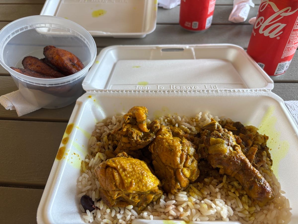 Ordered the curry chicken and the jerk ribs: The curry chicken is my favorite because the chicken falls right off the bone and it is cooked well. The jerk ribs are really good, but I’ve always been a chicken fan first. The rice and the vegetables are delicious and do a good job of supporting the main act.