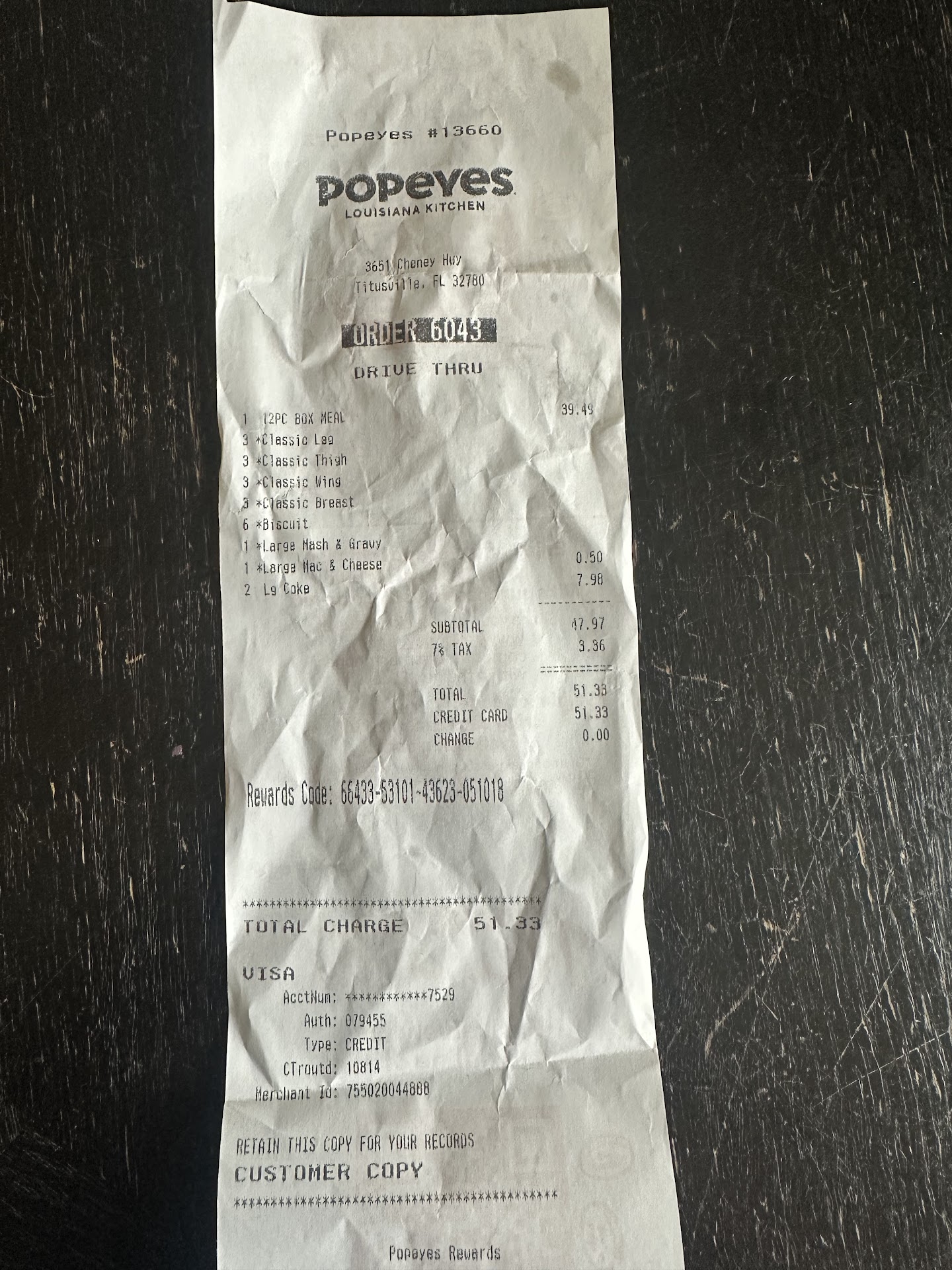 Read moreI don't normally take the time to write a negative review. But in this case, I will make an exception. My wife had a busy day, and asked if I could take her somewhere for diner. She has always had a liking for Popeye's chicken with her favorite side dish of rice and beans. Upon arrival, we were immediately informed that the rice and beans were not available. Disappointing. So, we decided to make the order as easy as possible, and ordered 2, two piece meals. One plain and one spicy. After placing the order, and paying for our meal, we were informed that they were out of chicken. (irony) But we were told that they were getting ready to prepare some more chicken, and if we could be patient, it would be available shortly. So, during the next 45 minutes while we were waiting for our food, I watched the a flurry of dissatisfied customers complaining about the long wait, wrong orders and no paper towells in the mens room. Not to mention the soda machine only dispensed carbonated water. When our order was finally fulfilled. Surprise. The order was wrong. Both were plain. No spicy. We spoke with several customers who got tired of waiting in the drive through and came inside to find out what was taking so long. One customer told us this was his second attempt today to place an order. And it was the second time today he was told he would have to wait. In full disclosure, my wife and I have eaten at other Popeye's locations, and have always been pleased with the experience. But, we will never again set foot in the Titusville location, even though, it is the closest location to our home. As I said in the beginning, I don't normally wast my time writing a negative review. But if it prevents one person from experiencing the disappointment we felt tonight. I feel it would be well...