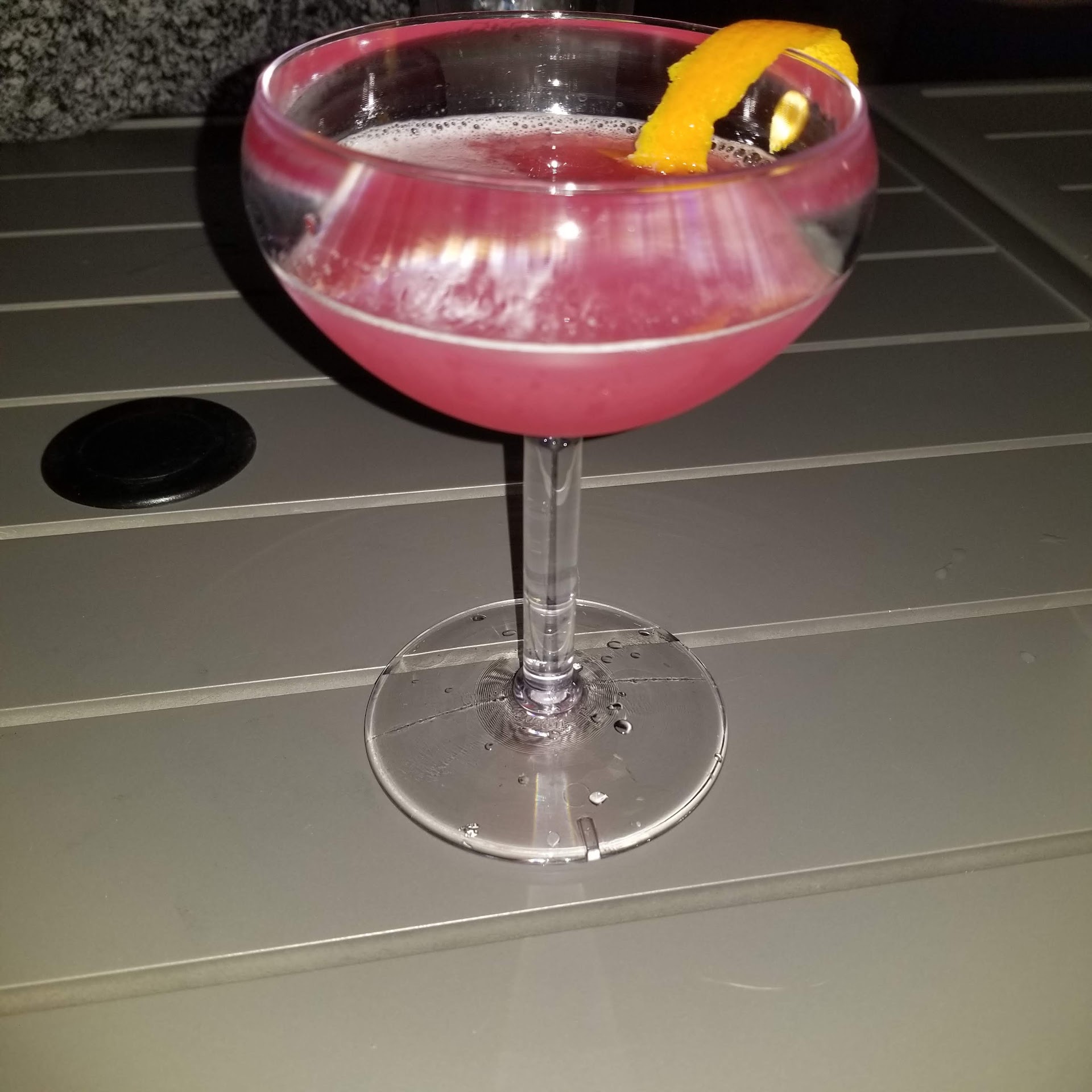 The Space Bar is located on the top floor of the Marriott and over looks the Indian River. We visited in the evening around 9 (it was Saturday night and they are open until 12). Immediately upon entering the hotel there is a sign for The Space Bar and a small elevator that takes you directly to the roof. You then take the door to the outside and walk down a short hall way that opens to the bar. The cocktail menu was priced as expected for a hotel bar and my Causeway Cosmo was delicious. Our server Susan was pleasant, attentive and helpful with ordering and information about the hotel and bar, and local sights from the rooftop showing us a little map that they have pointing out the various space industries and buildings that can be seen from the balcony. We ordered the potato sausage flat bread and the nachos with black beans and braised short ribs. Both were presented very nicely, amply sized for sharing or as a meal, and delicious as well. The space has a great vibe at night with several areas for photo ops other than the scenery and night sky: there is a huge lighted canvas mural of a moon walk and couple of cozy egg chairs with a lighted cube table nestled in between and I can't forget the astronaut in the lobby. Definitely will...