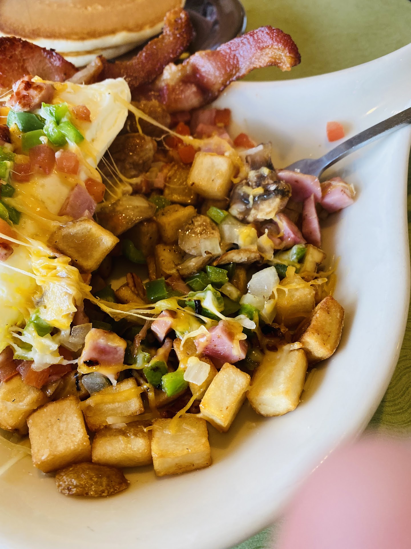 The Ultimate Skillet contained frozen, not fresh hash browns, ham and veggies. However, for a chain restaurant, I am impressed with the execution as it was pulled off flawlessly with perfectly cooked eggs. The flapjacks were a scrunch overcooked, but oh so buttery and milky on the palate.