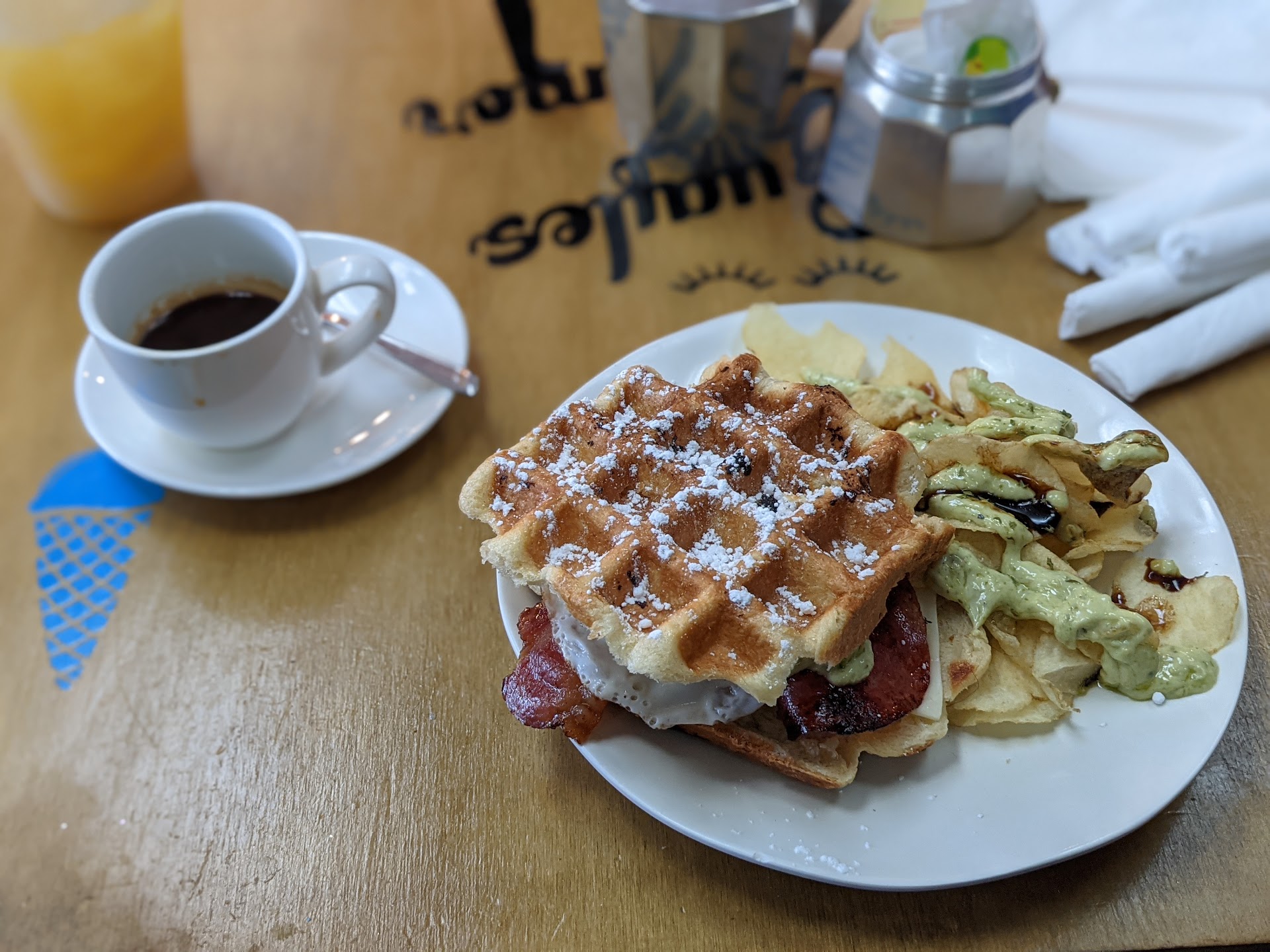 For a place called “Guaffles” serving one small waffle for 9.50 seems waay overpriced. Even thought the waffle itself was good, the portions sizes are a bit ridiculous, so I would suggest they raise prices so you can at least eat two waffles. Because having to pay more than 20 dollars to just eat two waffles without anything else is insane. Also, selling bitter and sour orange juice for 4 dollars is also a...