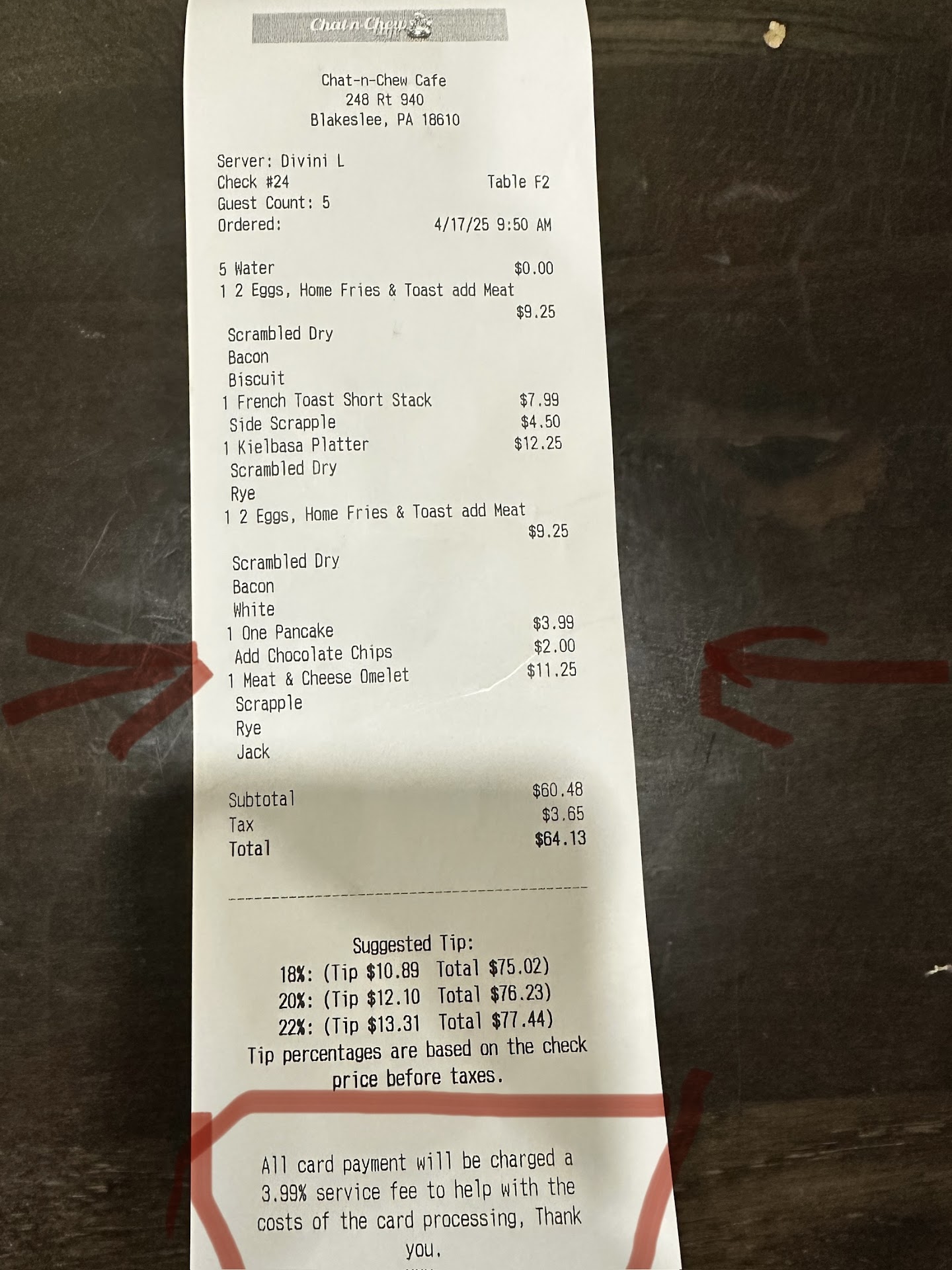 Food is great, The waitress Davini Was a doll. Extremely welcoming and professional. Food came out fast, But when the bill came, he charged the six dollars for one pancake with chocolate chips. It did not show on the menu what one pancake would cost, and it actually averaged out as the same price if we got short stacks. We also noticed that there’s an automatic four dollar charge so they can “offset The cost of using a credit card” Which is absolutely ridiculous because everywhere we go or have went only require that at least $10 is spent and no fees would be added to your card. This is a clear cash grab, And honestly, extremely unprofessional and disgusting. Imagine if they have 200 customers coming in today times that by four that’s $800 In one day. Times that by Let’s say six days a week, That’s $4800 a week. Let’s say $4800 a week times four, that’s 19, 200 a MONTH!! This is a hustle and I work too damn hard to just get charged for no reason. I told the waitress about my concerns, she was again extremely kind and said she would speak to the manager, which I believe may also be the owner, Don’t quote me. The manager was seen yelling at the waitress from a not too far distance by my eldest daughter and was heard saying “ Maybe if they just looked at the menu instead of complaining” A few minutes later, the manager walks up to us Really jazzed up coming off like she drank 12 cups of coffee In a matter of an hour. Her responses were very sarcastic and dismissive, And attempted to make us appear As if we were trying to get some sort of discount without actually saying it. As a pro Latino male, Seeing how this all white staff or customers, And white manager or owner And how they treated this young black queen, Was heartbreaking. She told her she had a child and needed to make a living, but she could see that she wasn’t really happy. I get this place may be a local favorite, But for me and my wife and kids to be staying at split rock resort in Lake Harmony for my 50th birthday, And this being my 50th breakfast gathering, It was a huge letdown and I would never ever return and I would encourage others to have them stop Adding four dollars to every customer’s check. We’re gonna add a picture of our bill and you could see it...