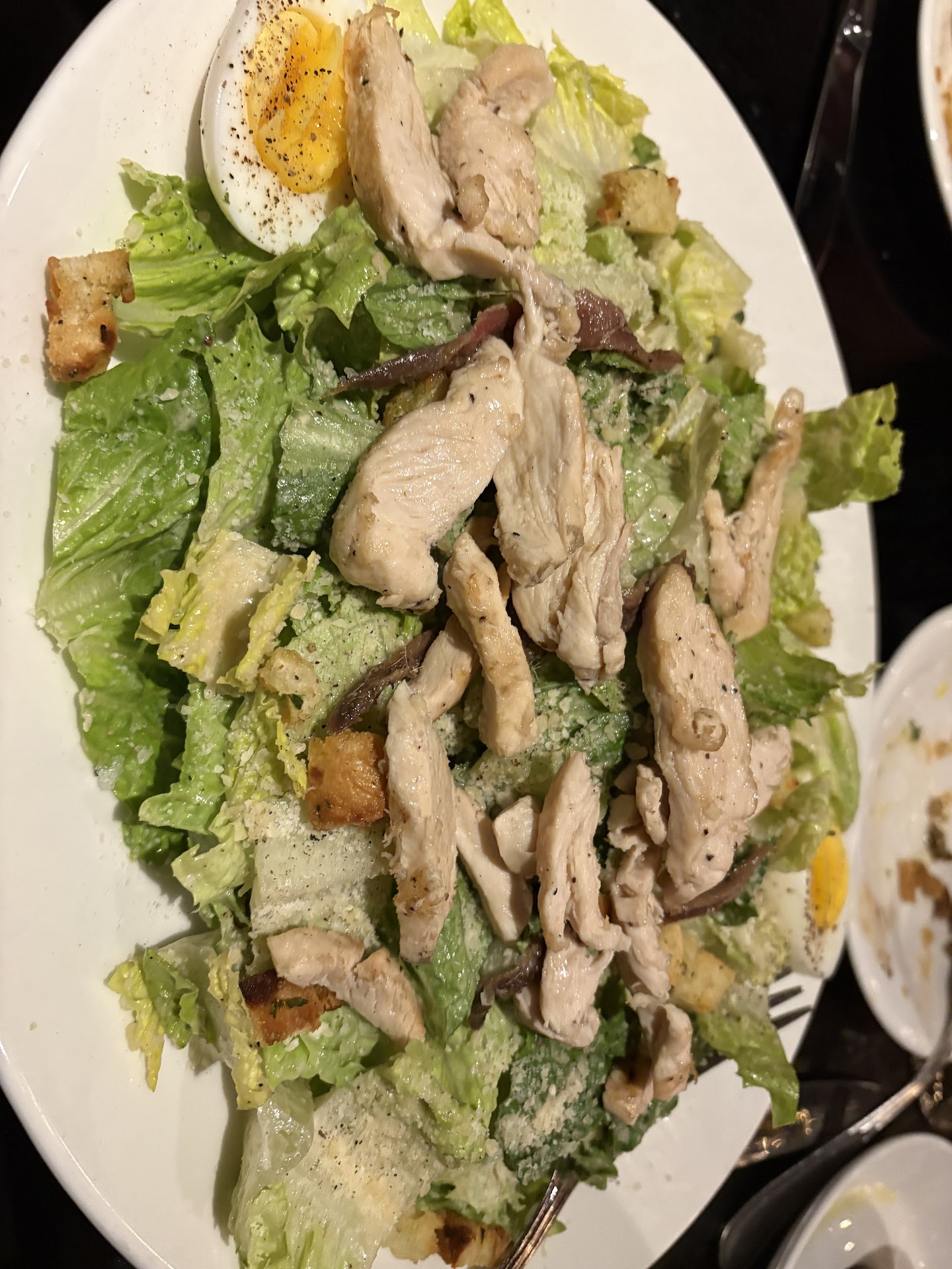 I got the Caesar salad for my entree with grilled chicken. $15 + $7 for chicken which Is probably the most affordable and biggest portion item you can get here. Lots of crispy Romain lettuce, anchovies and a perfectly cooked soft boiled egg. The dressing on it was light and the chicken had a strong but delicious grilled flavor. I loved it! My husband had a burger, he got it well done and it was dry though he liked it. Also it was very salty. The burger did not come with fries and the waitress brought them over for us but then charged us $7 for them.
