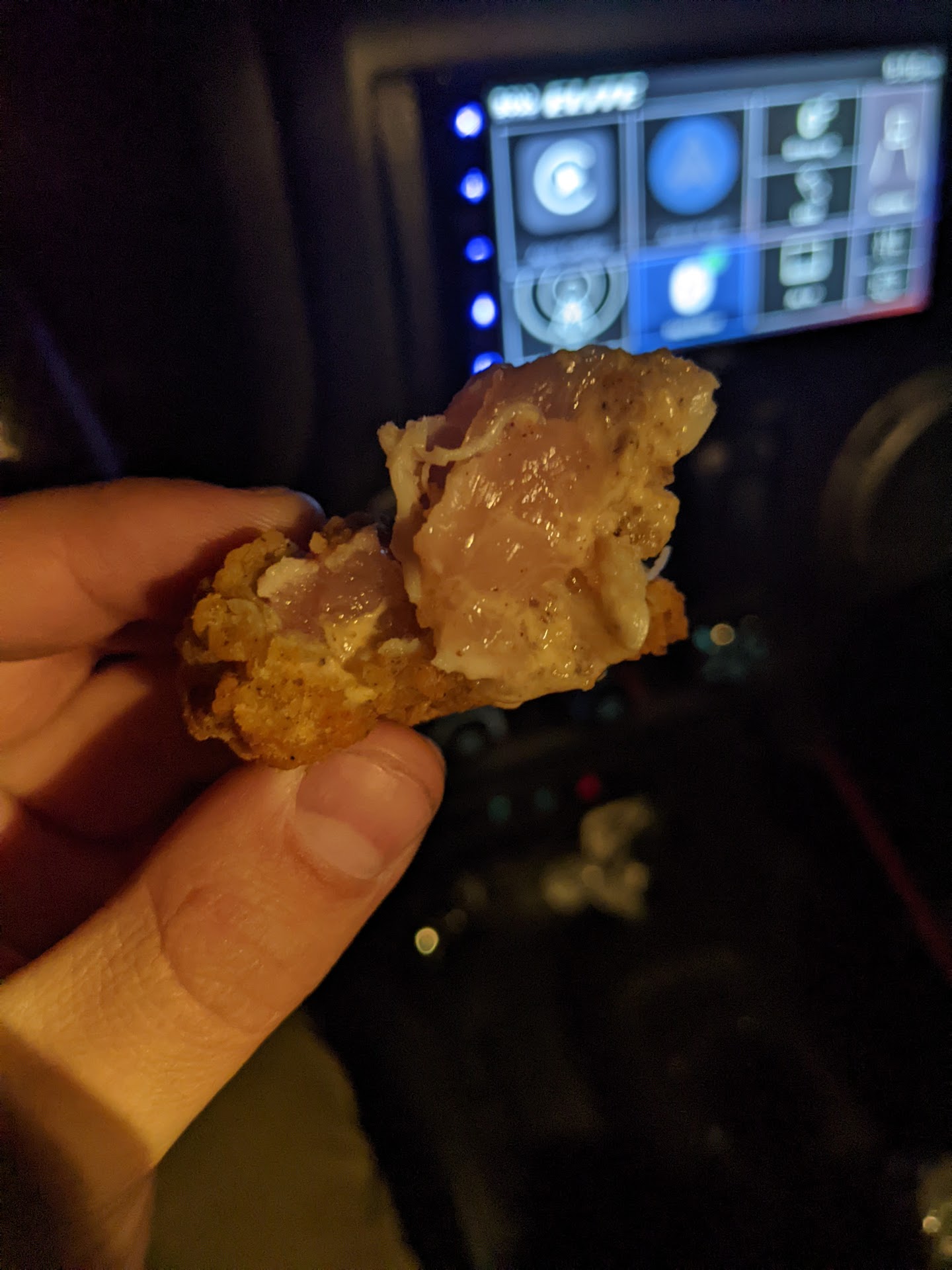 Ā Ā Ā Read moreThe staff was great, but I received raw food. I ordered a brownie a la mode, a small butterfinger blizzard, and 2 chicken strips. Upon biting into the chicken, I thought that I'd bitten into a fatty piece, but I soon realized that it was raw. I pulled over to wash my mouth out (in fear of getting sick) and took the following picture. This stuff happens and I get that, but I will hope that this message will help others in the future.