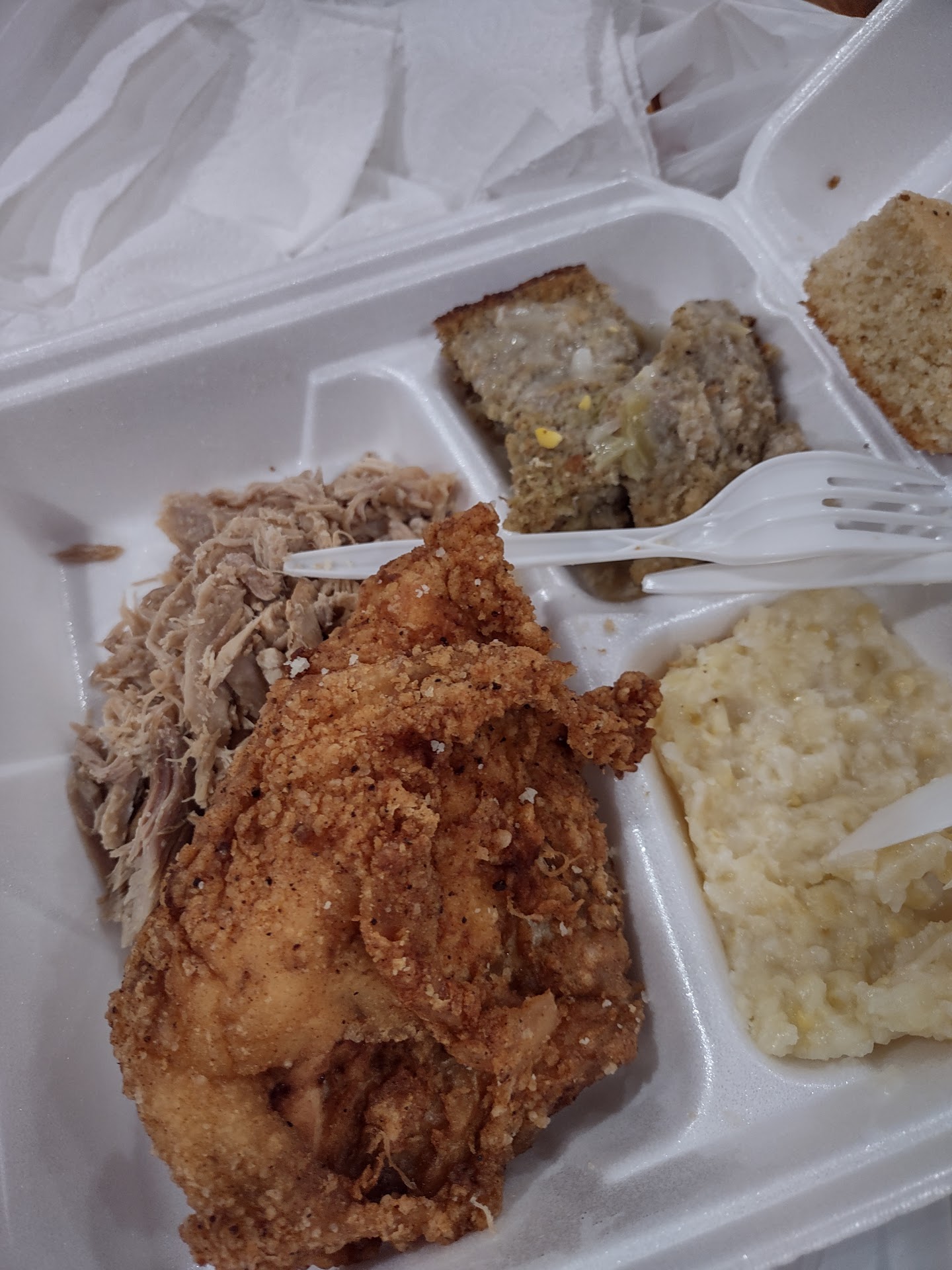 The fried chicken breast tasty and dry. The shredded barbecue turkey was also dry.