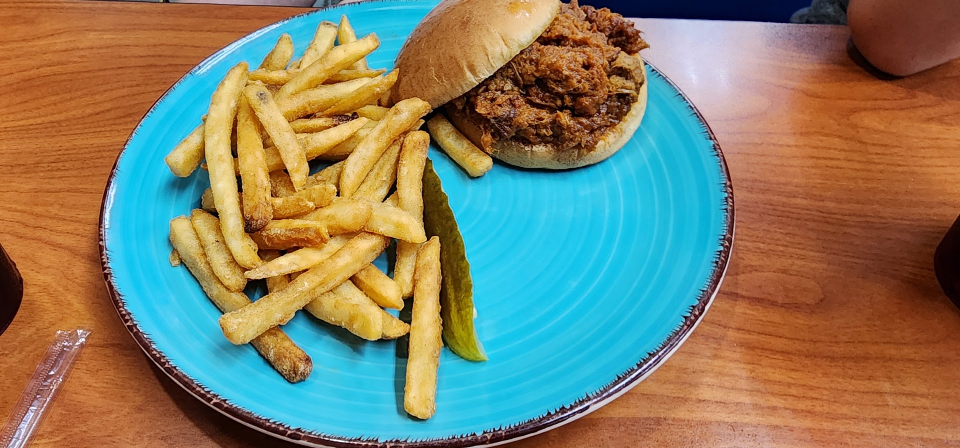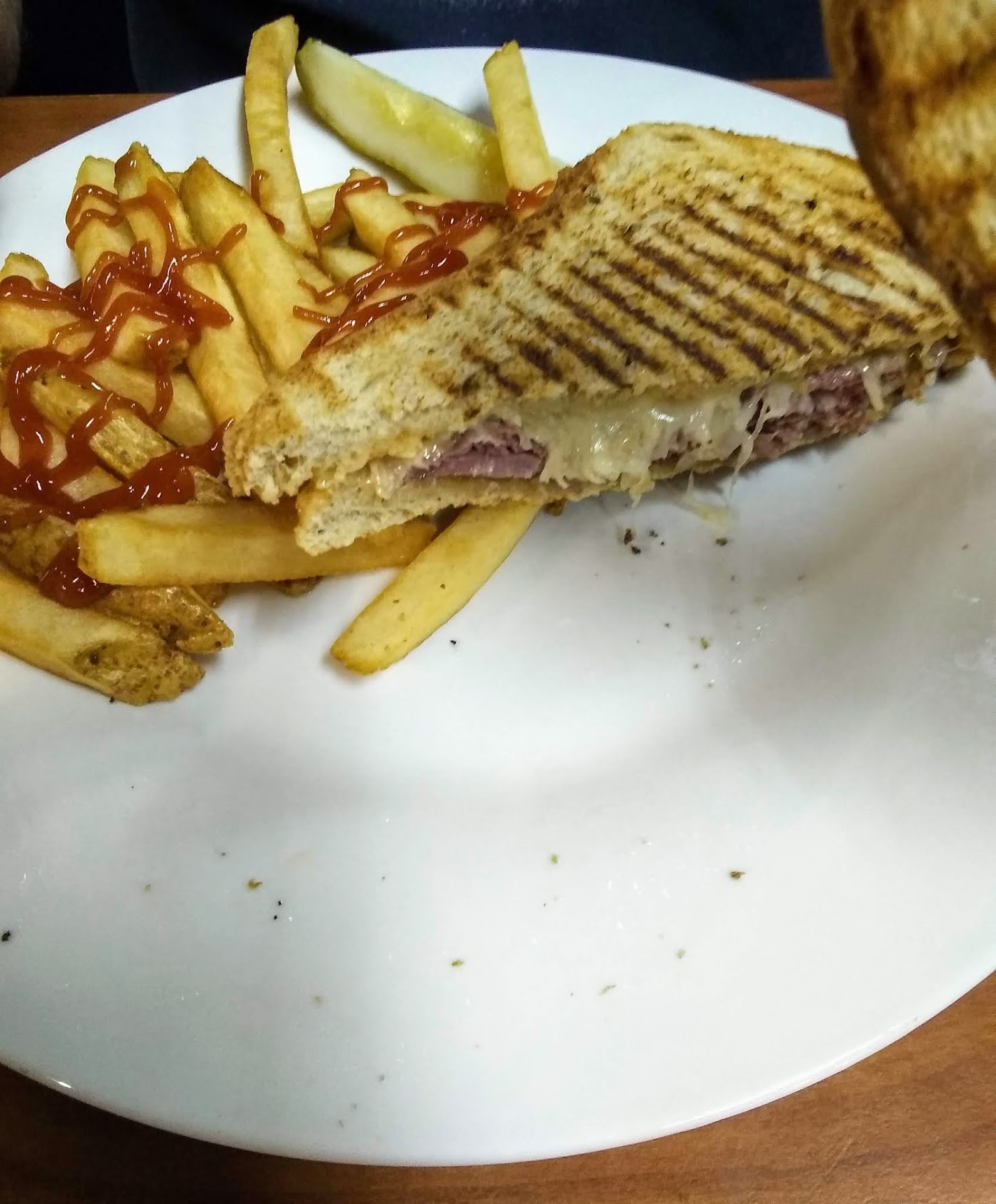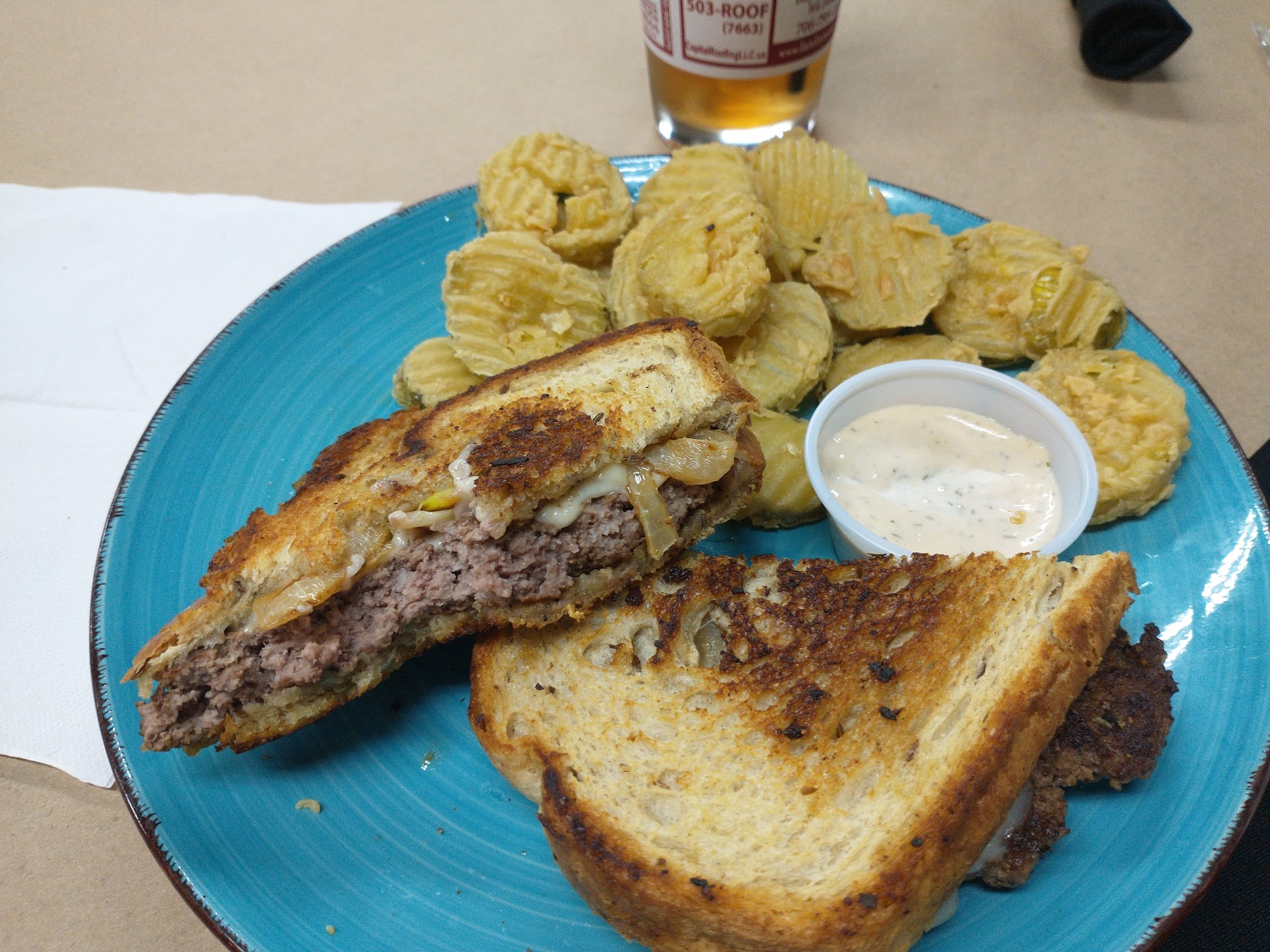 The food: Our table ordered two Reuben sandwiches and two Cheese Burgers. The sides where 1 order of Fried Green Tomatoes and 3 orders of French Fries. The Cheese burgers looked good and tasted fine, the Reubens on the other hand were sloppy and soggy. The corned beef was not spread evenly and they required utensils to eat. The French Fries had inconsistent portions with one plate having roughly half the fries of an another, the flavor was good but that was all. The Fried Green Tomatoes had good flavor but were adhered together. The portions were small and underwhelming. Price was ok.
