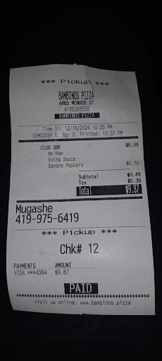 Ā Ā Ā Read morePlaced an order a few weeks ago for pickup. After the guy at the counter made a huge deal about opening the boxes to verify the order was correct, it was missing toppings. Nothing was done to correct the mistake other than the guy saying "I'm the only one working, I make mistakes" Tonight we ordered delivery. Watched the driver deliver our order two doors down although we tried to get his attention prior to him actually delivering it. The tracker said that was our driver. Called the delivery tracker service because Bambino's clearly doesn't answer the phone. We're told there was a technical difficulty, our order hasn't left the store but was about to be prepared. This, over an hour after the order was placed and their tracker showed their driver deliver the order to the wrong address. After the driver delivered the order, my finance asked did he possibly deliver it to the wrong address? He ignored the question, got in his car, stopped in front of our actual house, looked at his phone for a minute then sped off, again without a word. What a joke of a business, with the name it has, it runs like...