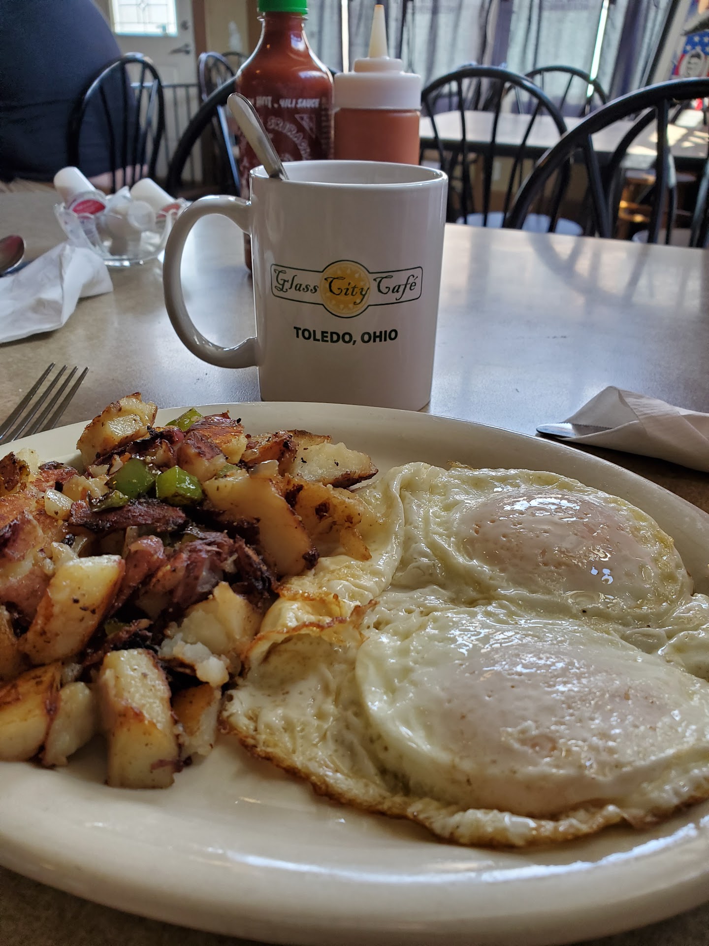 First off, it's a diner not a cafe. They have a full kitchen and serve real breakfasts and lunches. No frappuccinos, or fancy coffees. That said, as far as diners go, they've got it all. Way more food on a single order than any one person should eat. Mediocre, yet, consistent coffee. Neighborly wait staff. And plenty of local paraphernalia to let you know that yes, you are in Toledo. Charming to say the least. Nothing 5 star or fine dinning about the place. But as far as blue collar coffee shops go, this one...