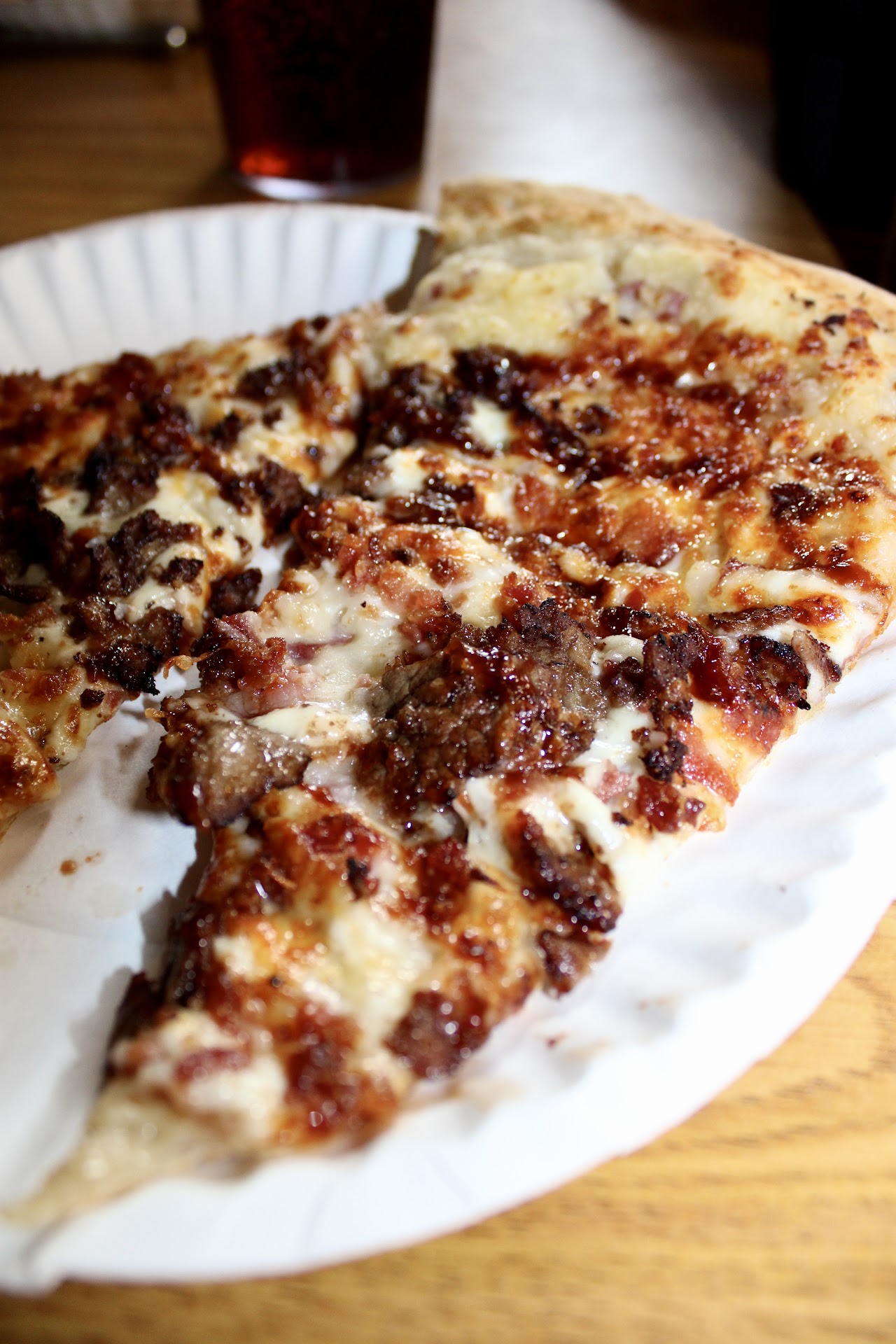 The DeCarlo, which is cream cheese, cheese, chicken, bacon, BBQ sauce, a little hot sauce, and cheddar cheese, was not too bad. This was our first time trying this pizza. I didn't think it was bad, but to me, it was just ok. I couldn't taste the bbq sauce or the hot sauce, and the bacon took over the rest of the flavor of the pizza. My wife thought that bacon was the only flavor that she could taste on the pizza.