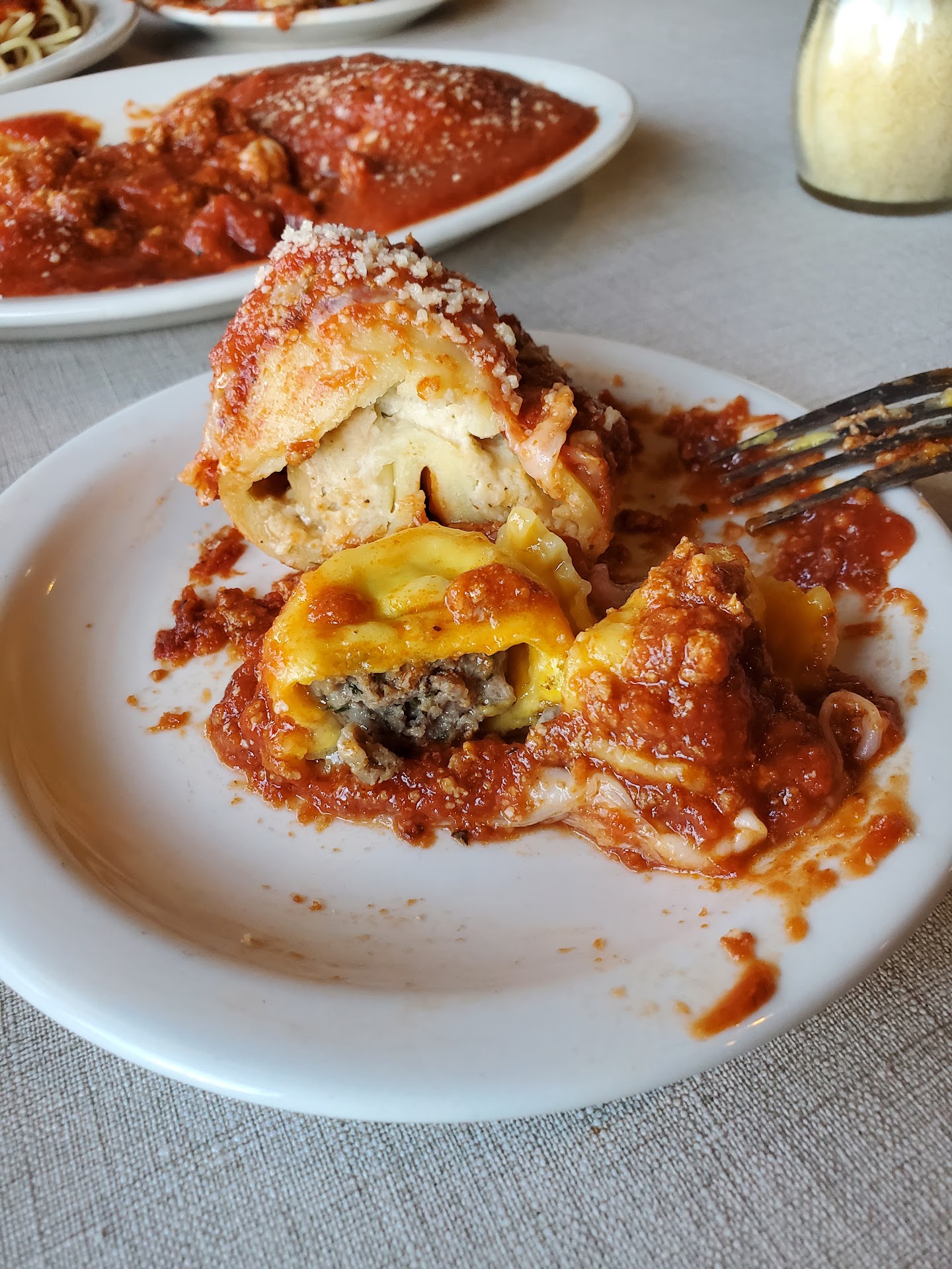 Last...thank God, but not least...the pasta. I ordered meat sauce, but when it came it looked like Ragu from a jar. The sauce was loaded with sugar, and as far as I could tell had no meat, but when I asked the waitress told me that it was meat sauce, but the meat was very fine????? The pasta was not al dente, but al gummy.