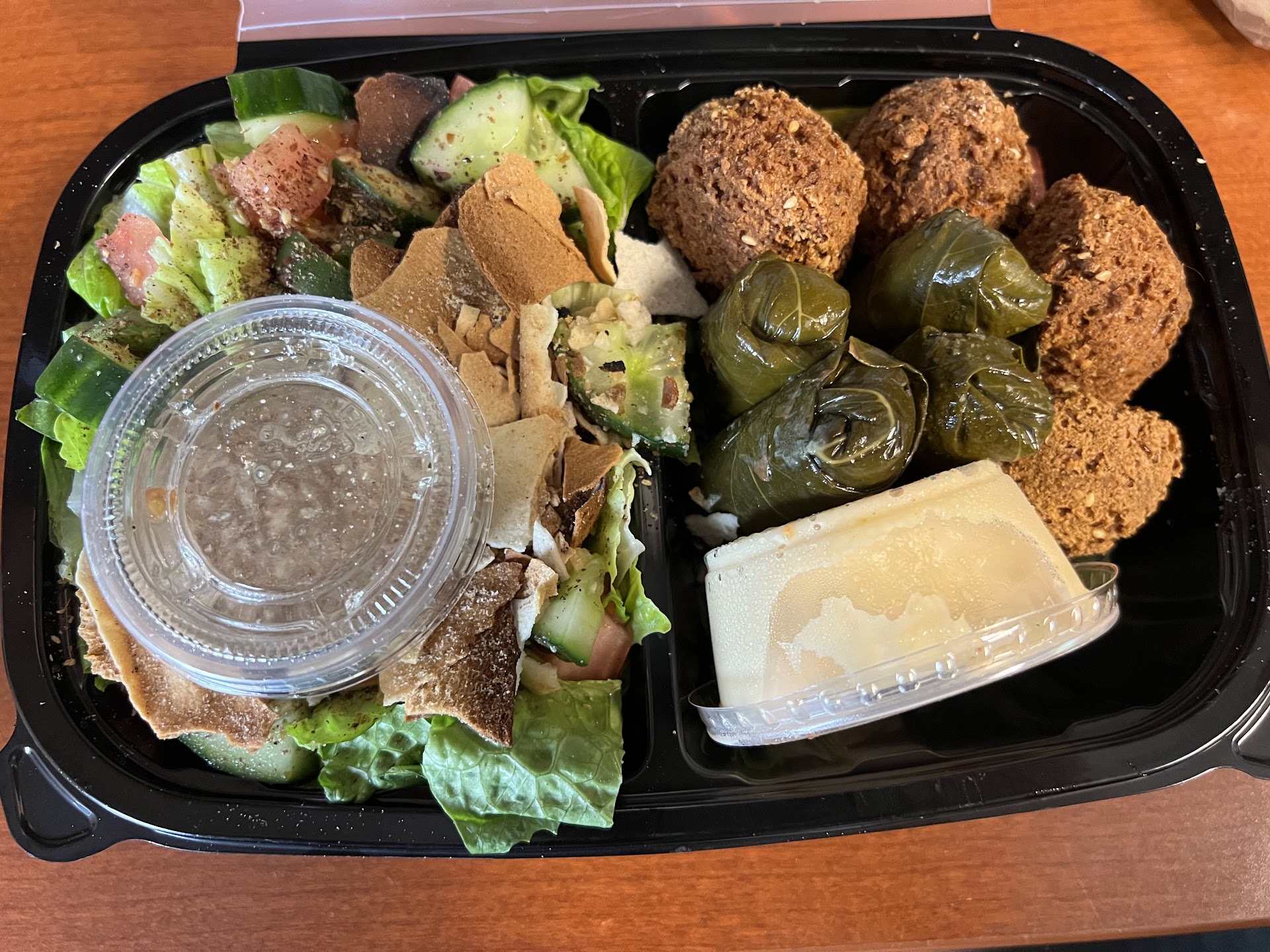I ordered a large grape leaf and a chicken shawarma salad with a fattoush base. The grape leaves are fantastic, juicy, a little lemony and such a joy to eat. The salad was a bit more disappointing, but still good. The shawarma wasn't marinated and neither was the fattoush. I was given a small container of fattoush dressing but because the chicken wasn't marinated it was somewhat dry. The dressing didn't help with the dryness of the chicken much. There also wasn't much flavor to the chicken. Overall the salad was still good, just not great.