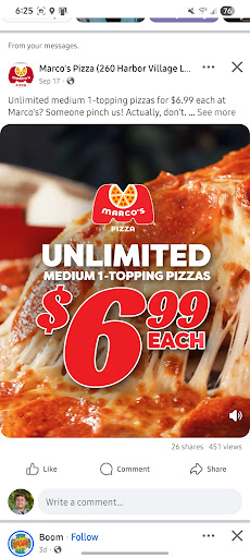 Read moreI like going to this marco's because it's very close to us, I can do online ordering and have never had an order be wrong. The flavor of the food is always consistently good and the people working there are all generally friendly when you stop in. The only issue I have ever had there is it seems to make my wife and I both very gassy feeling. We don't load up our pizzas, just usually pepperoni, ham, mushrooms or pineapple and get some cheesy bread. Later on, we both seem to pay for it... not sure if it's just us or a common theme with others. We still go from time to time but have explored other pizza places in our area...