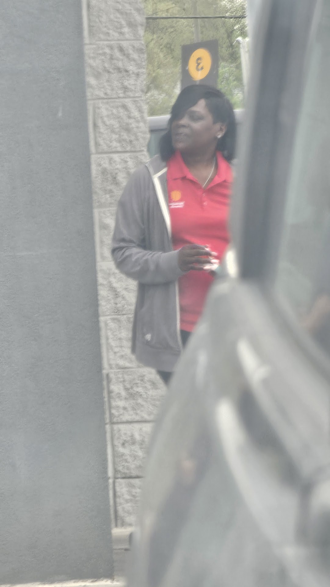 Here's a picture of said older black lady in her 40s who is wearing the red McDonald's shirt, she's out front of the restaurant smoking a cigarette.