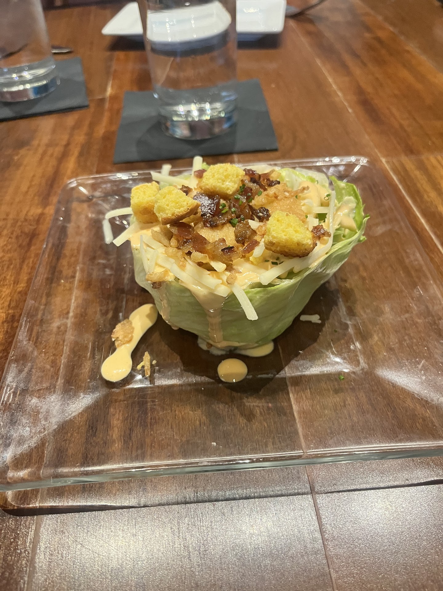 Moving on to the main courses, J & L were underwhelmed by their pork shank and filet. The filet was visually appealing, accompanied by a unique potato dish resembling a bone with bone marrow. The pork shank had a nice smoked flavor but was distinctly “porky.” Bud and I both had the meatloaf burger on brioche with bacon jam and coleslaw. While bud loved it, I found it good but not to my taste as I’m not a fan of meatloaf. However, the accompanying fries were phenomenal. I also had a wedge salad, which was excellent with crispy onions and a tasty dressing.