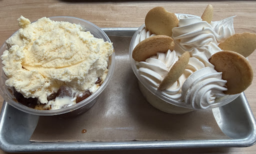 Pictured are two desserts. The meat is so good, I had to try the desserts even though I am always way too full after eating the generous portions of meat. Hands down, the best banana pudding Iâve ever had. The cream on top is rich, sweet, and tastes like it was handmade by a French pastry chef! itâs amazing. The other dessert I tried was an apple cobbler with ice cream. This thing weighed like 5 pounds! Also amazing! My wife and I had to âspoon dualâ over who got to finish the whipped cream (I lost).
