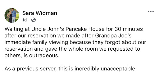 We had reservations for 1 PM on Sunday for their private room. We had just attended a funeral for the most important person in our family who loved and cherished uncle John’s pancake House so we made sure to make reservations so that our family could grieve and be together.