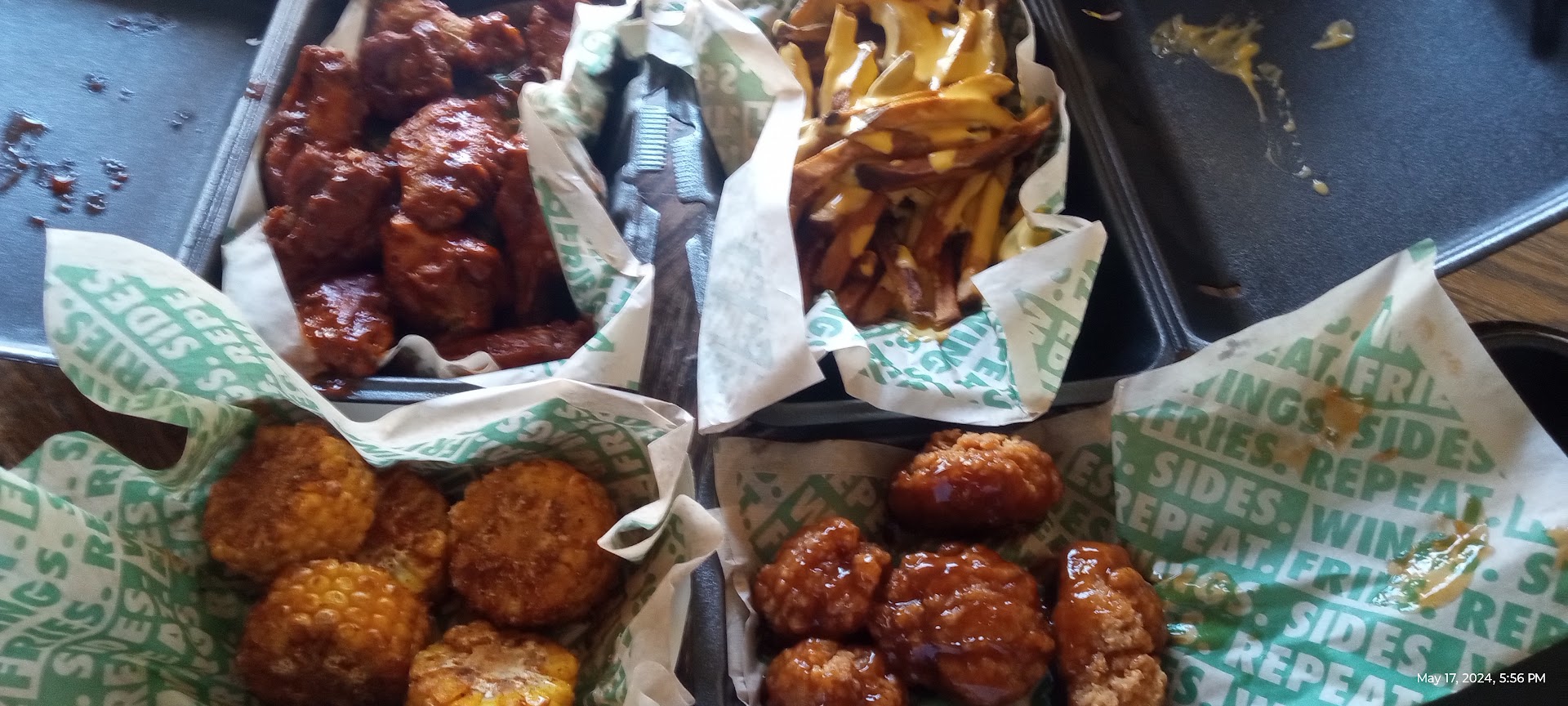 Ordered 4 flavors of wings. I asked that two of the orders of the same flavor be separated and the receipt even specified they be separate but they were thrown together in the same aluminum pan. The workers were inattentive on the phone and in person and lacked the ability to comprehend an order easily when i was already speaking slowly and being specific. They over sauced wings and dumped the remaining sauce in the pan which would have been fine had they not been too lazy and cheap to separate my lemon pepper from the sauced wings so now i have lemon pepper mango habanero mix "gross" the other problem was with the cajun wings i ordered i assume they use a base sauce and a dry rub and shake together well these looked as if all they did was dump the wings in and shale the dry seasoning on top of them some wings had way too much powder while the ones at the bottom were flavorless. For the cost of these wings and the lack of basic ability to prepare them properly i don't see how the campaign for service workers to get paid $20 an hour could ever hold water. I will not do business with this location again not simply due to the food quality and the basic interactions with the staff but for how the manager responded when i called to address the issue for context i live very close to this place and the store was not busy after i picked up my order so the fact that i sat on hold for over 20 minutes because i immediately asked for the manager is crap when i finally got to the manager it was because my wife had called on her cell with her innocent voice as if applying for a job got a manager in 2 minutes after explaining the issue i was confronted with the "what do you want me do do about it attitude" to which i replied i am fine with it they are still edible but some people might get really angry and cause an uproar about this kind of thing to which my answer was the action of the manager hanging up on me.