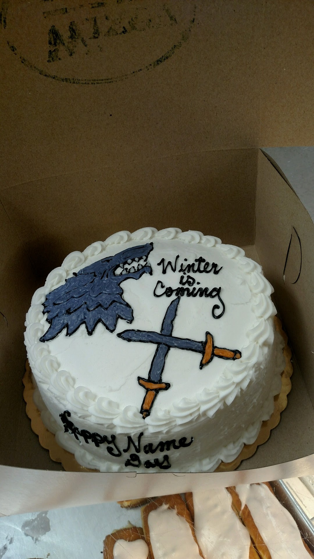 Read moreHad a themed GOT German chocolate birthday cake made. Called them 2 weeks in advance. Communicated by email and phone, sent pictures. Told them exactly what I wanted and received a cake that looked gaudy. It was a GOT themed cake & you couldn't even tell. The wolf was actually really good, but I explicitly asked for the writing to be in the GOT style writing. And I didn't ask for the swords to be on there. I sent two pictures of what I was kinda going for (one of the pics had the swords on it so I'm assuming that's why they added them?). But i communicated in my emails and conversations on the phone what was most important from the pics I had sent which was: the wording, the writing style and if a wolf could fit to please add that. Instead they slopped "winter is coming" in CURSIVE in the upper hand part of the cake. It looked like an after thought in the small space between the wolf and swords. They also wrote "happy name day" in cursive on the outside of cake where they totally had space so write it the correct style. And again in my email and pics the writing was not in cursive. As I'm writing this I feel some may think I'm being a little too critical. However, anyone who is a GOT fan would undoubtedly look at the cake and be like huh? And it would take time to register that it's GOT theme because it just looks odd-it looks like a kid's cake with a wolf and swords and some cursive happy birthday or something. I was hoping the taste made up for not recognizing the theme on the cake but it was not impressive. It was too sweet-way too much frosting. The kids liked it,so I left the rest of cake (half) for them to take home. My mom and aunts got their wedding cakes from wixley so, they were highly recommended. I just didn't get what I...