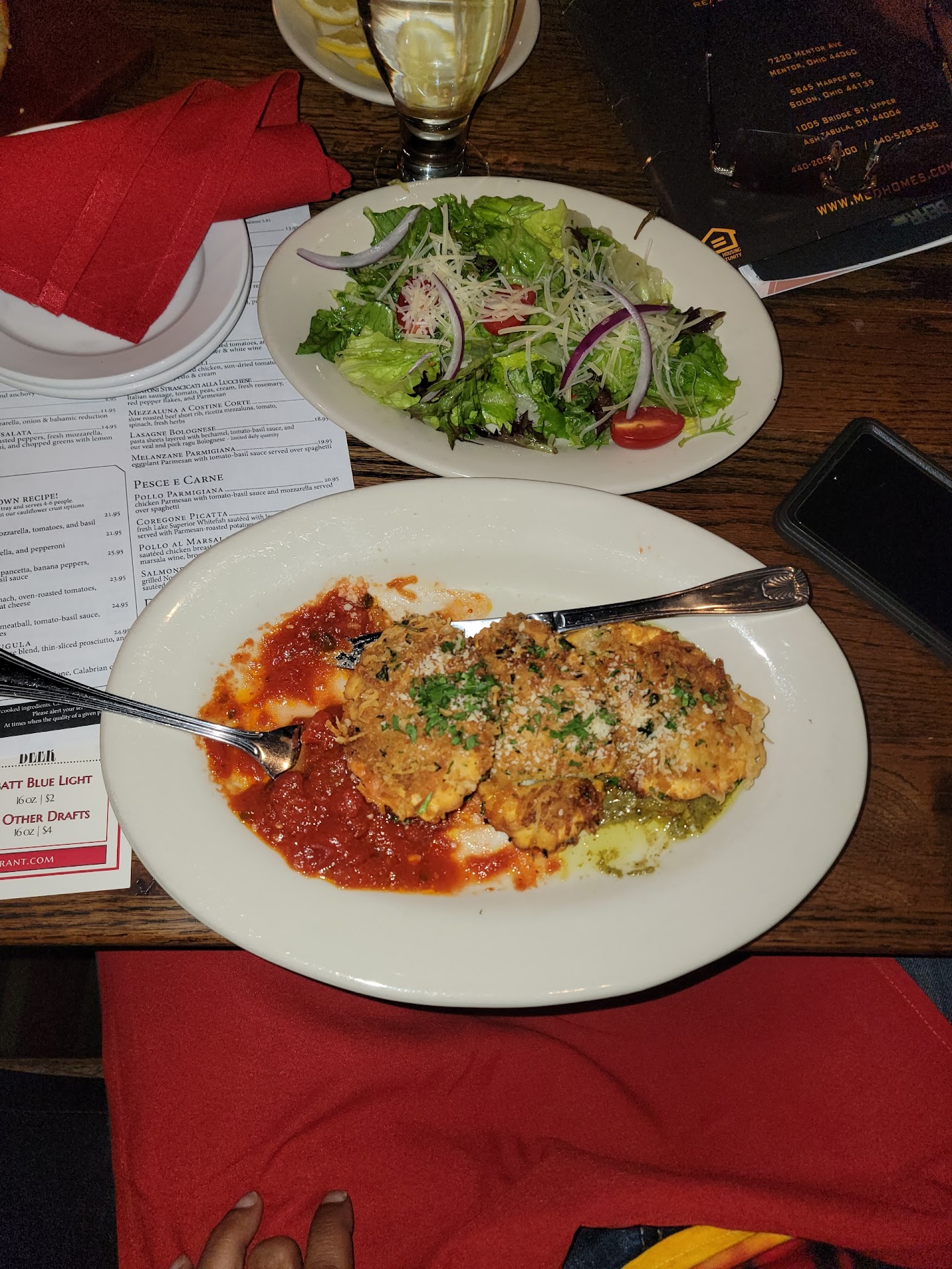 We were served 3 courses (family style). The appetizer course was okay. Bruschetta, a flatbread pizza, and salad. Each table had 12 people. Only one pizza (cheese, no meat), a plate of Bruschetta, and a much too small plate of salad. Not quite enough to go around but I did get a bite of each and it was 'okay'.