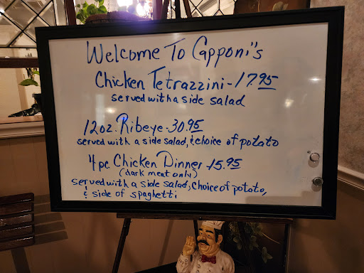 Read moreI've been enjoying Capponi's for years. They serve excellent food at reasonable prices, great iced tea, the manager and staff are warm and friendly and the atmosphere cozy. My favorites are the shells Florentine & the fillet. And I LOVE the garlic bread with cheese, it's hands down the best I've ever had. A lot of people like their chicken. I don't like anyone's chicken because chickens are only good for laying eggs; not for eating. Not once have I had a complaint about this fantastic restraurant. You guys...