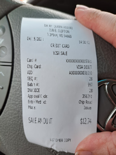 Read moreNot very happy at all! They had a new employee working at the cash register. The total was $11.00 something and I handed her my new $15.00 gift card to use. She swiped it but then didn't know what to do so she swiped it again and didn't know what to do and she just kept swiping the card, then finally asked for help. The lady with the pigtails came over and swiped it (hello it's a damn gift card if you keep swipping the gift card 10x there isn't going to be any money left) and rudely said it doesnt work. I explained to her that it is a brand new card so figure out what is going on. She then walked away. The new employee said the card did go through the first time but didn't know what to do next. So she went over to the pigtail girl, while showing the receipt the pigtail lady grabbed it out of her hands and threw it away. So anyways....since they said the gift card didn't work. We ended up paying out of pocket. I ended up calling the DQ Gift card people and they said That the card did go through today at Tomah. I told them that's nice, because the DQ workers said it didn't go through.Never...