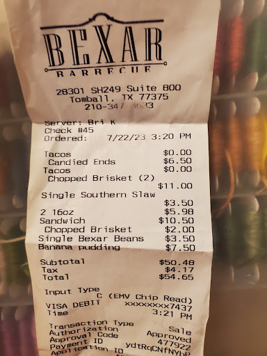 Read more2020-10-22 Thu. 7p. Bexar Barbecue in Tomball, Texas has friendly staff and a very tasty menu! I’ve eaten 100% of it and it’s all been very good. They make everything homemade from scratch except the tortillas which are also very tasty. All their meat is smoked there too & they can go mobile to visit events. For some trivia, they pronounce it BEX-er, not bear.