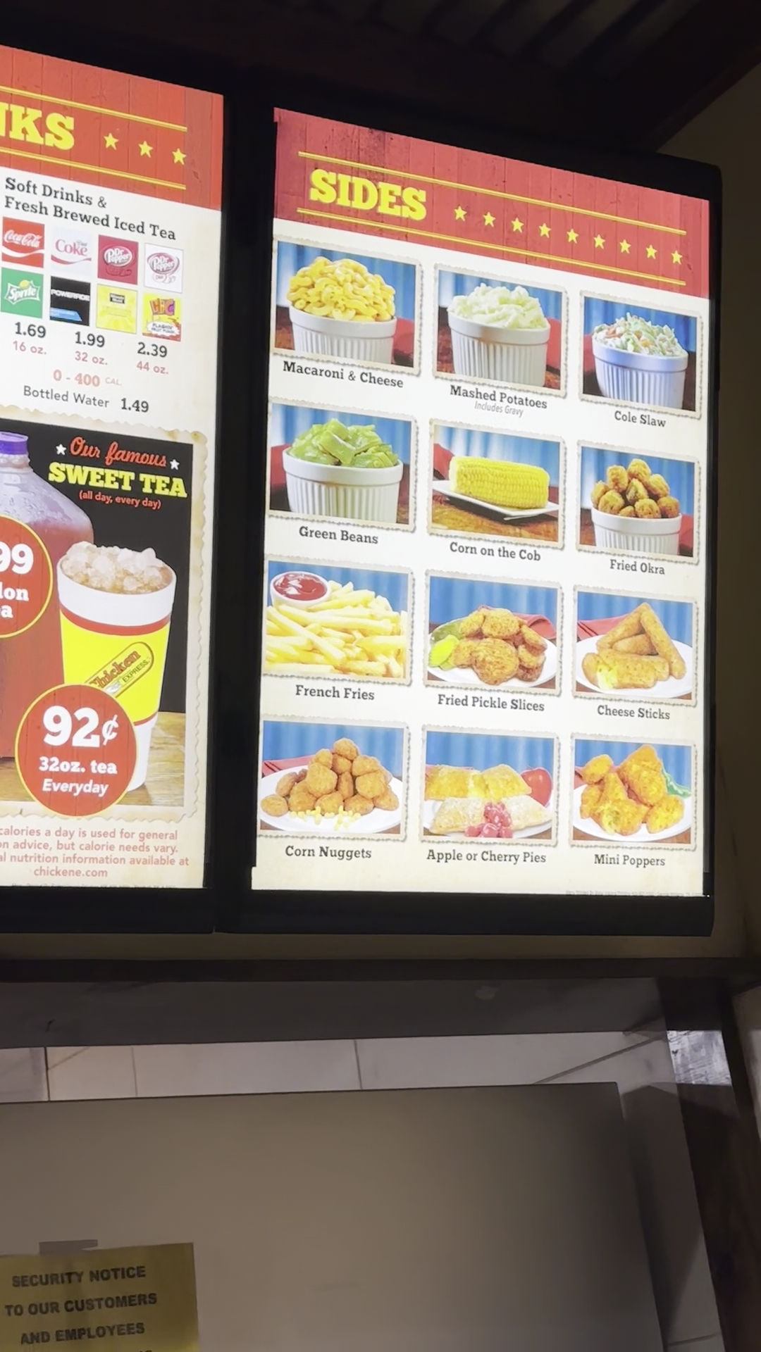Read moreThis place is a little on the expensive side when your ordering for family but we like it a lot. The service is ok they don't really say much just grab your payment and hand you your food no extra comments. We have to wait at least 10 minutes for them to make more food every single time we've ever been. Most of the time the sides are cold and soggy by the time we get the chicken. I think paying $60+ the food should be a little better prepared. The last 3 times rolls were not fresh and were dried out chicken was hard and overcooked and tiny tenders. Corn nuggets are delicious (even when they are cold) and sweet. Fried okra is a huge hit in our house fried pickles are really good too but good luck getting any they fun out quick! Fries are good if your getting a small portion but if you get them as a large side they are definitely going to be soggy. The cheesesticks are really good too. Mashed potatoes are good and their gravy is so good to dip everything in. Last time we went our gravy was literally white water. Zero thickness to it so I would assume it was just someone new that made a mistake on that and the rolls. Hopefully...