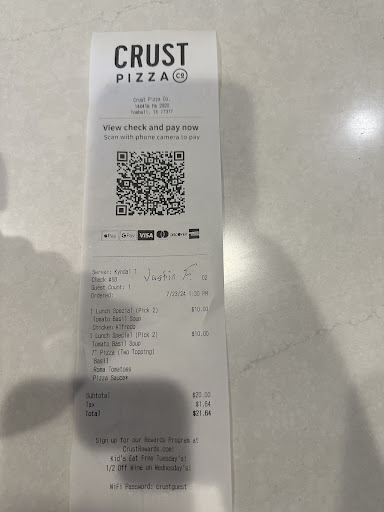 Ā Ā Ā Read moreMy friend and I were in Tomball on FM 2920 to get some new tires for my cargo van at NTB. We decided to go across the street to grab lunch at "CRUST PIZZA" while the 4 tires were bring installed. I ordered a 10" personal Margherita pizza and my buddy ordered the 10" personal Don's which I called a Carnivore's delight which is all meats and cheeses. (I'm a vegetarian). The pizza crust was buttery tasting with a nice crispness on the bottom but tender where the toppings came together. My fresh tomatoes were thickly cut, fresh Basil was abundant and fragrant, the fresh whole milk mozzarella provided a nice gooey cheese pull. My friend's Don's pizza was loaded with all kinds of meats and cheeses and I swear it was about 3" deep and overflowing just the way he liked it. I appreciate they serve the pizzas with a party cut making it easier to eat. Service was quick, and very courteous. The wait staff were also quick and attentive. I highly recommend this location. They also have an outdoor covered patio area with ceiling fans and a nice big lawn area a few steps down from the patio in back. I would surmise a small group or family get together could have a good time at this location too....