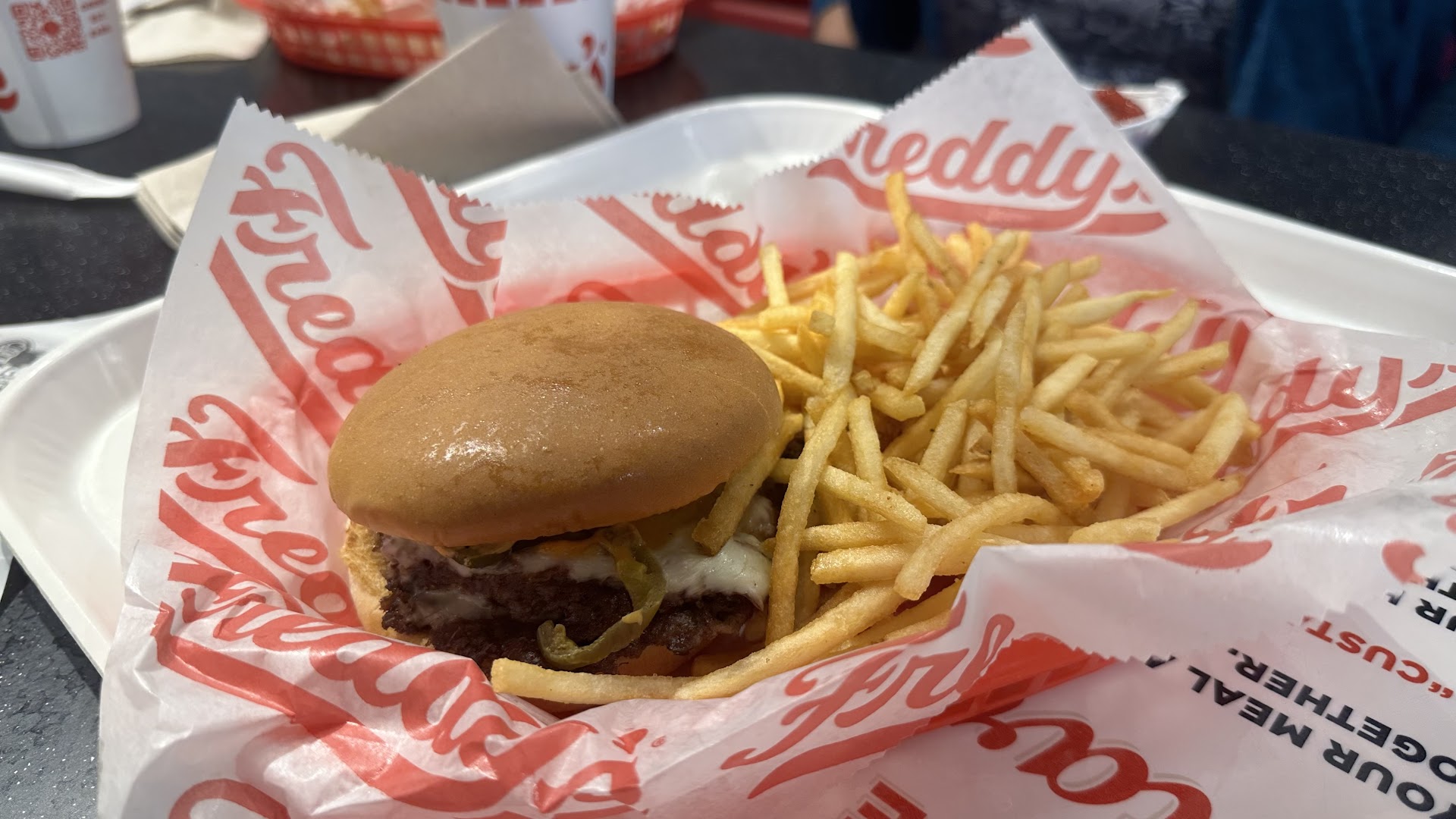 Read moreI heard we had a Freddy's in Tomball and decided to try it. I wasn't disappointed. I got the double steak burger w Fries and a chocolate shake. The restaurant was busy so we waited a little longer for our orders than normal, I suspect. Our patience was rewarded with a hot meal to grab from the counter. As far as I can tell, Freddy's Steak burgers are prepared and cooked "Smash" style, which I like. Mine had a very slight warmed-over flavor to it. The fries were hot and crispy shoe-string style and I tried the spicy mustard. I prefer my fries larger with my big clumsy fingers, but they were tasty. My favorite part of the meal was the chocolate shake. It was rich and delicious. You definitely need the extra thick straw to enjoy it. It's almost like pudding in consistency. I highly recommend the shakes. I consider FreddIy's to be a top-notch burger place in the FFood category, up there with Culver's and other iconic burger places. I...